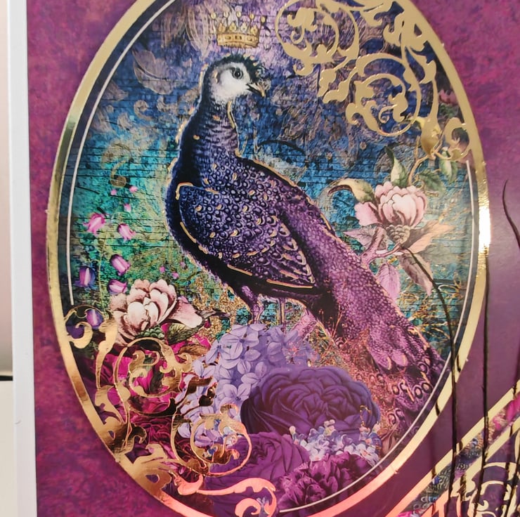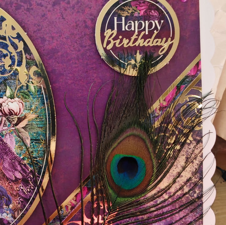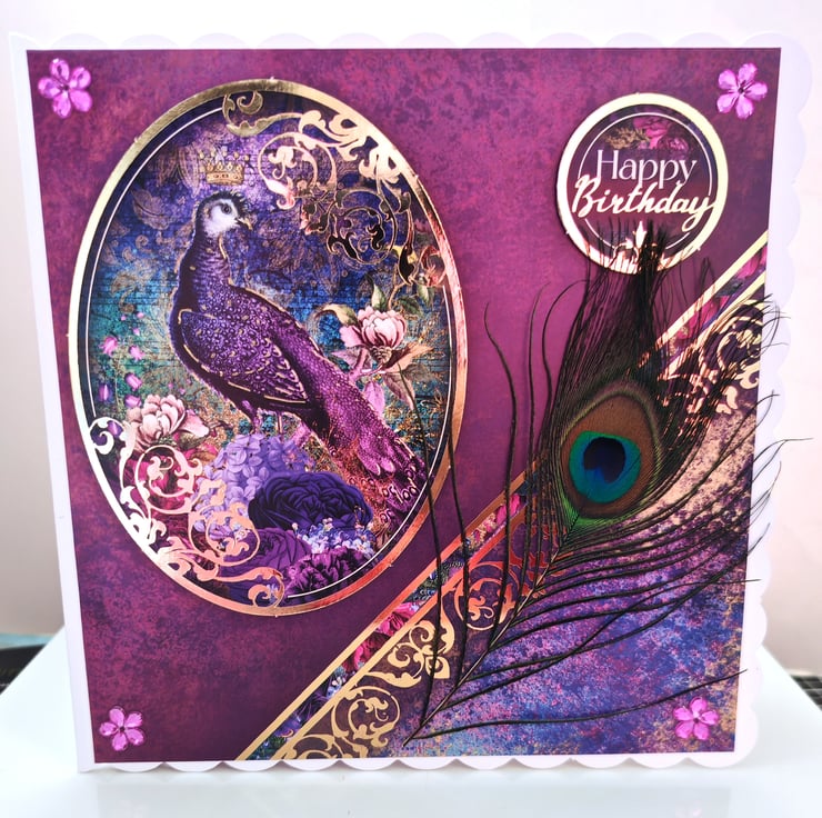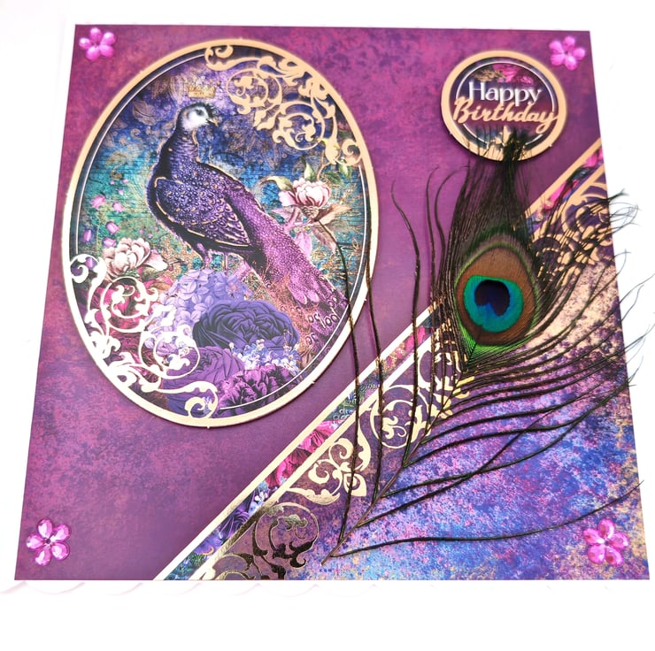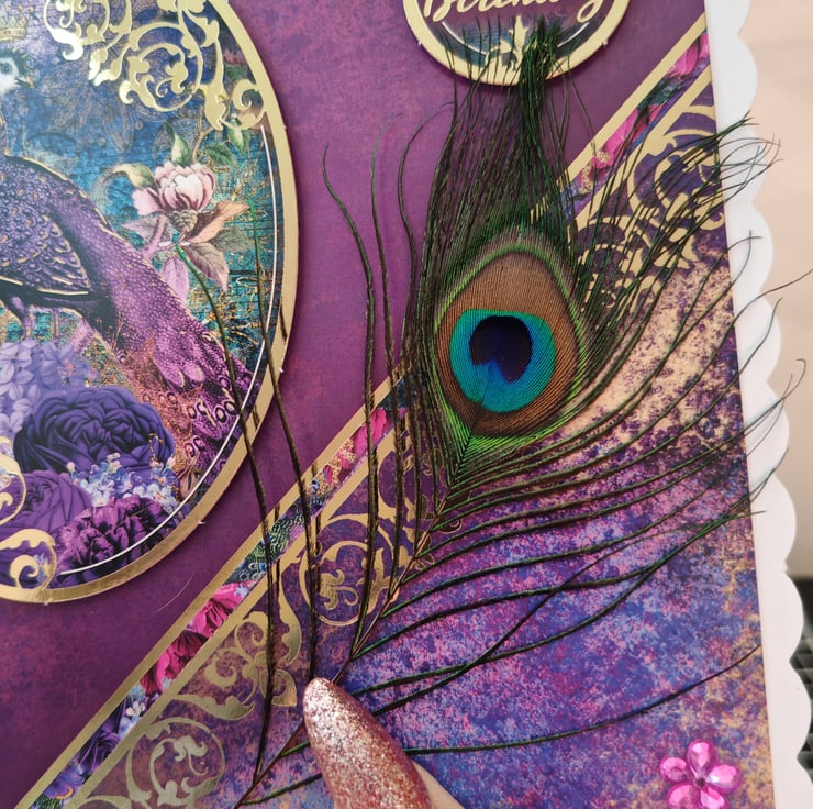 This luxury Birthday card is handmade by me and features a lovely purple and gold peacock with pink crystal flowers and a large genuine peacock feather embellishment.
