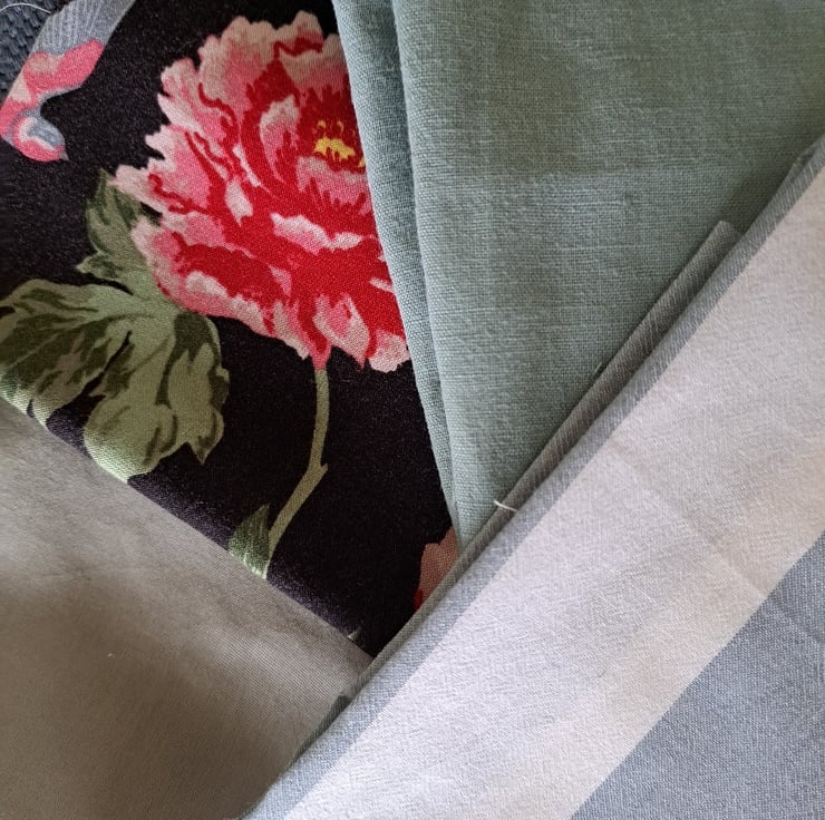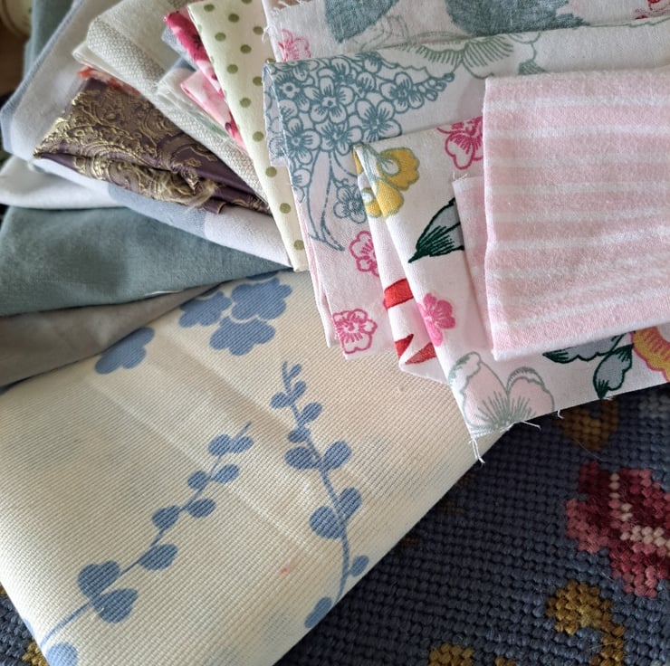 So called because the colours are posh-bedroomy, like something a French courtesan might have favoured. This bundle is a biggie, well over 20 pieces of all shapes and sizes, including a large piece of textured cotton (I think) featuring blue blossoms and measuring 75cm along the selvedge and 150cm in width. These are nearly all cotton although you'll find the odd bit of linen as well as a piece of viscose and some rather regal paisley satin.