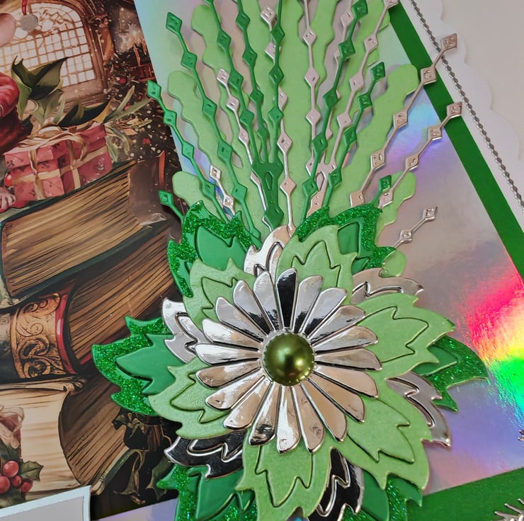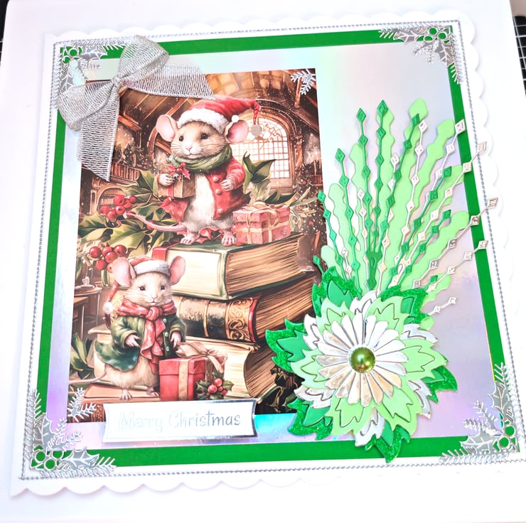 This luxury cute card is handmade by me, beautiful 'santas mice at work' picture in a green bckground with a large green flower embellishment with peral and white organza bow