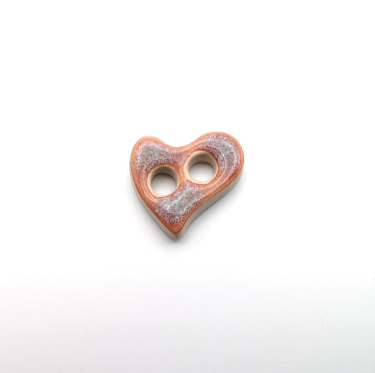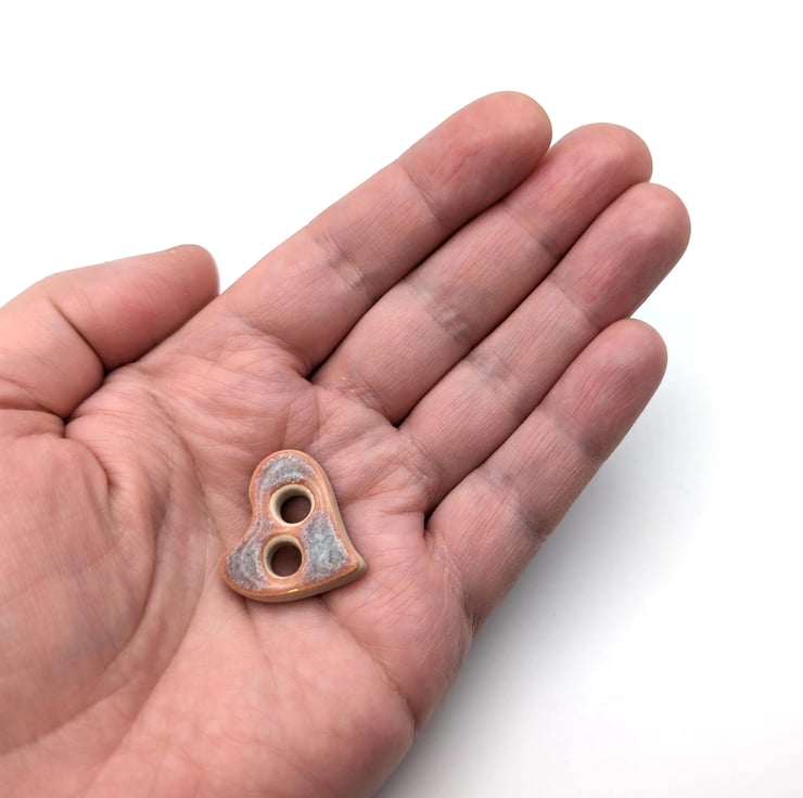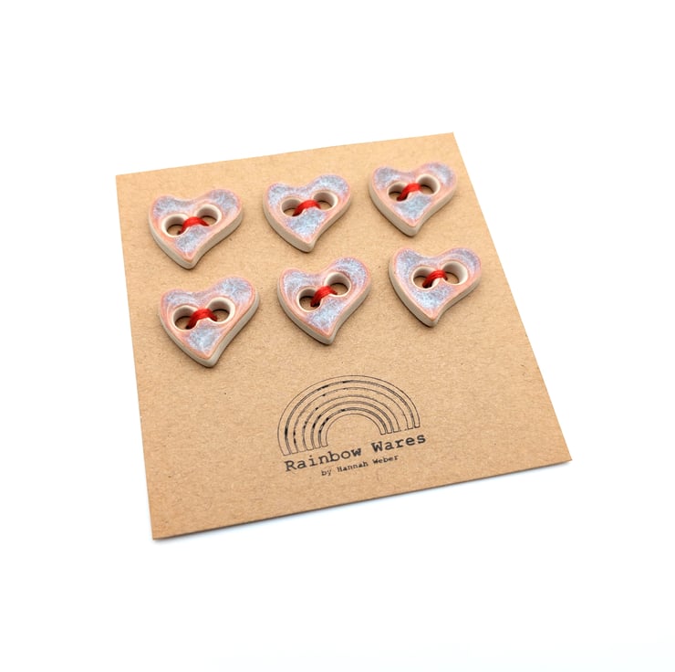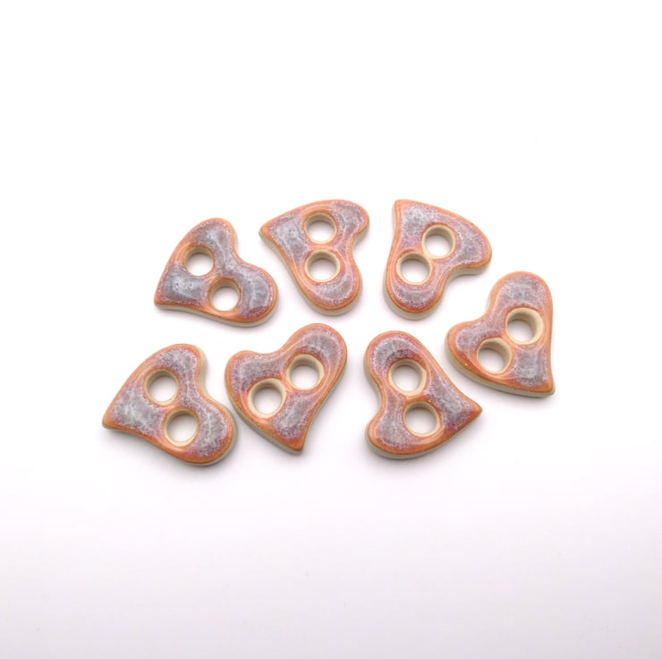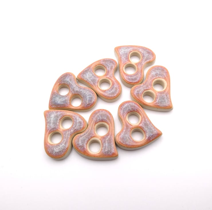 Set of 6 small heart shaped handmade ceramic buttons decorated with pink kimchi effect glaze and made from a white stoneware clay. Ideal to complete your knitting, crochet, sewing or other unique craft project!
