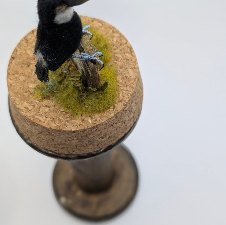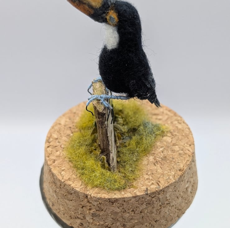 Presented in its own scenic tiny world this miniature bird is just over 3cms long and 7cms tall, is perched on tiny wire legs, has a minute wool beady eye and a fabulous over-sized orange beak for which his species is famous. He has individually crafted flight and tail feathers. Scaled to 1:12 of life-size, this dainty little bird fits easily inside the 9cm high by 6cm diameter glass bell jar sealed with a cork stopper.