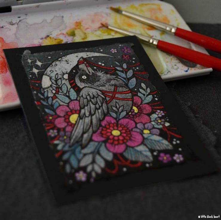 this aceo is an original artwork, hand drawn with a tiny 0.05 nibbed pen, then coloured with ink, artists pens and watercolour paints, on indian khadi paper. khadi paper is handmade from recycled cotton rag, it has a lovely textured surface and deckled edges. i have then mounted the illustration onto 300gsm cardstock, hand painted with a paynes grey to create a dark surrounding edge/background.