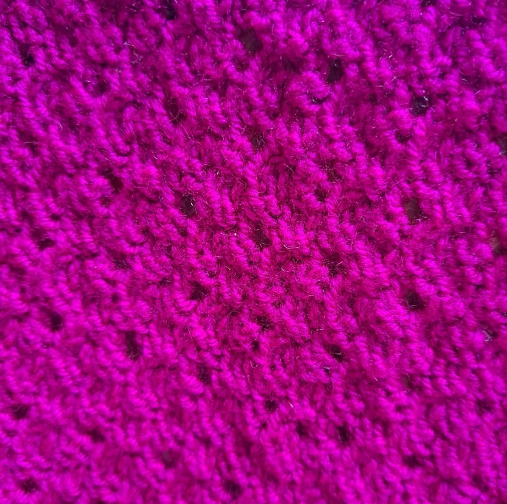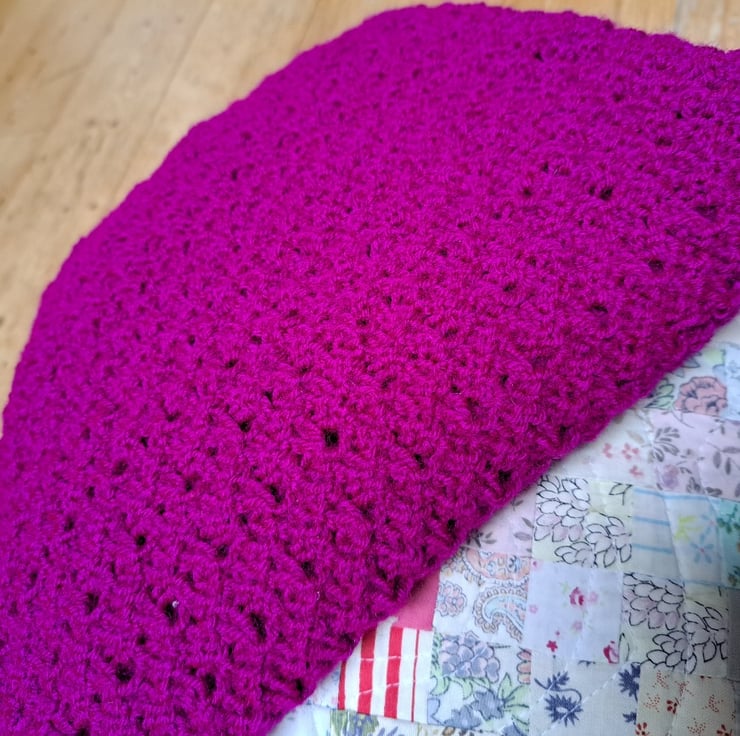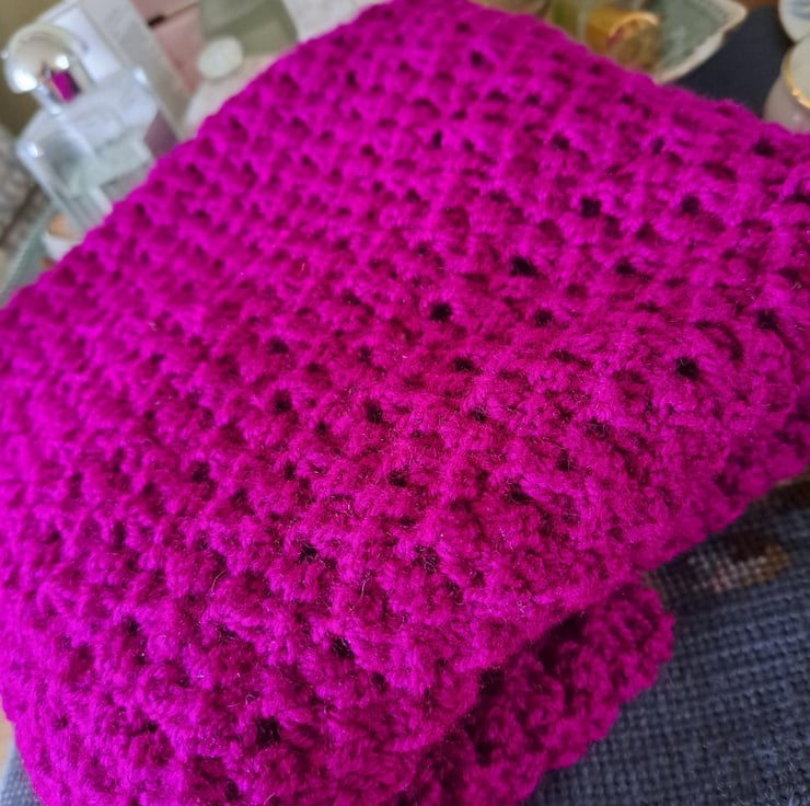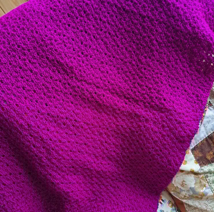 Not quite as vibrant pink in real life as in these pictures, but a lovely deep cerise. This hand-knitted (by my mum) baby blanket is made of a washable wool acrylic mix and measures 99cm by 71cm - ideal newborn size or to cover little knees in a baby buggy.