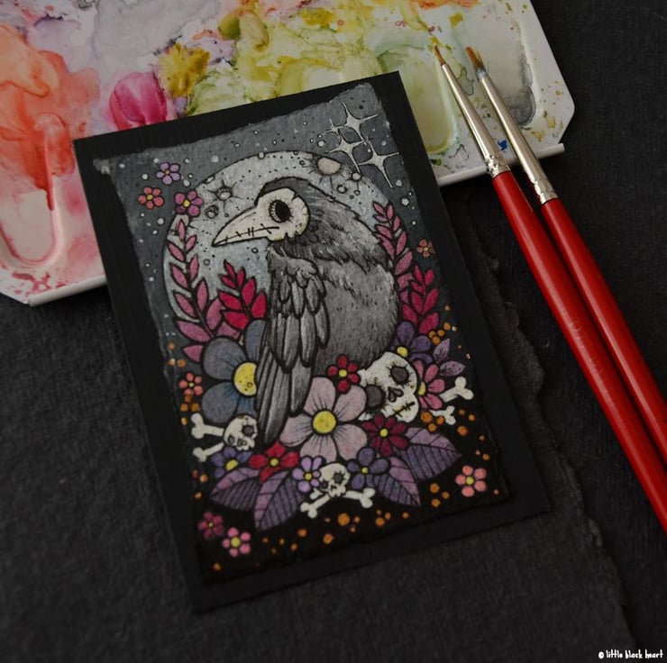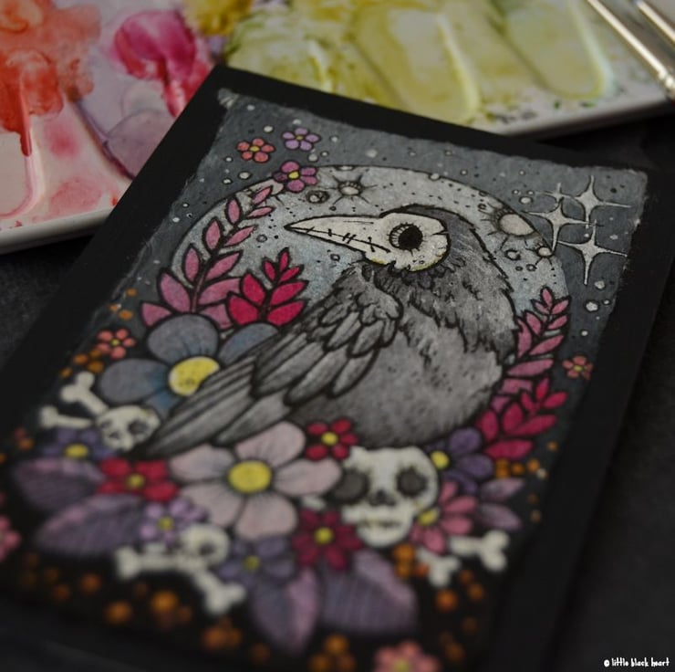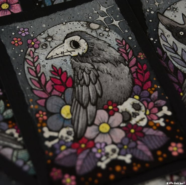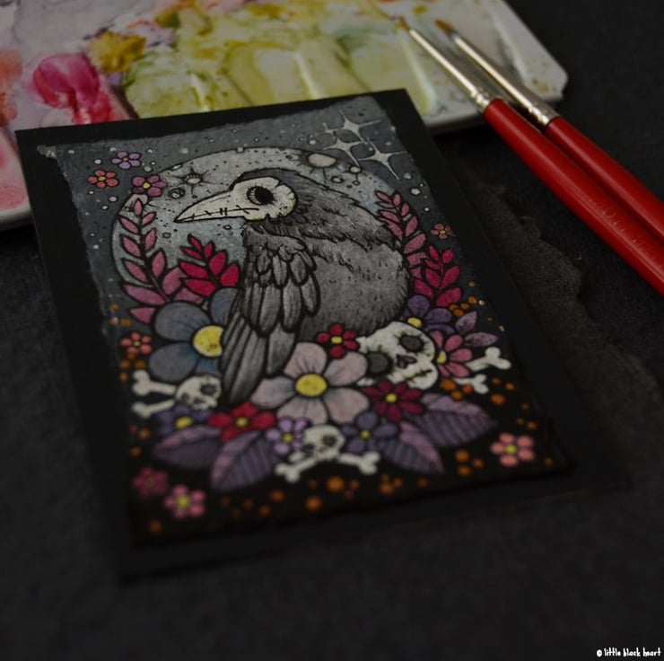 a little bone faced crow sits upon his bony floral nest, plotting a little mayhem (probably).