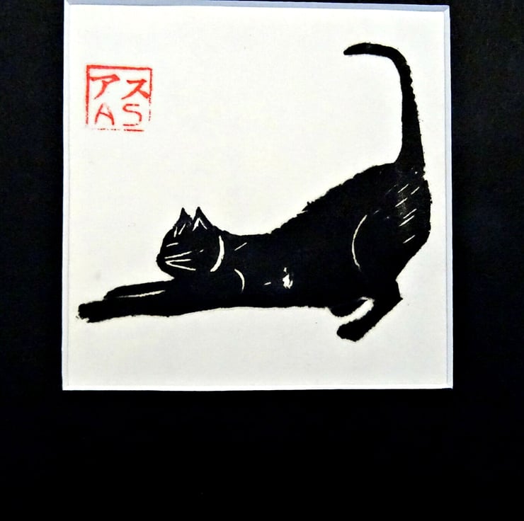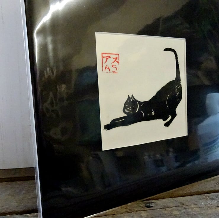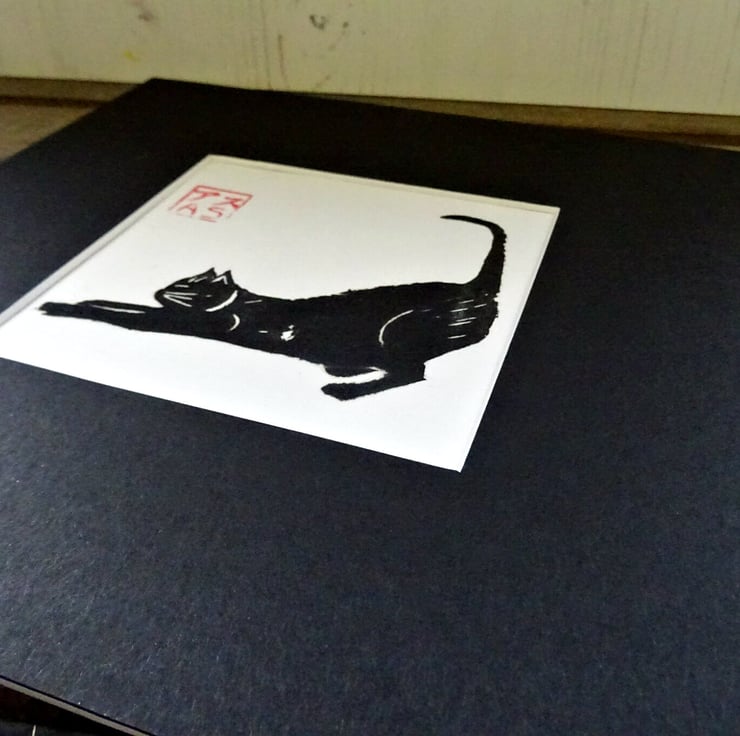 This little black cat was hand carved in lino before being printed using oil based black ink onto Sumi rice paper which gives a lovely texture and slight creamy colour to the background.