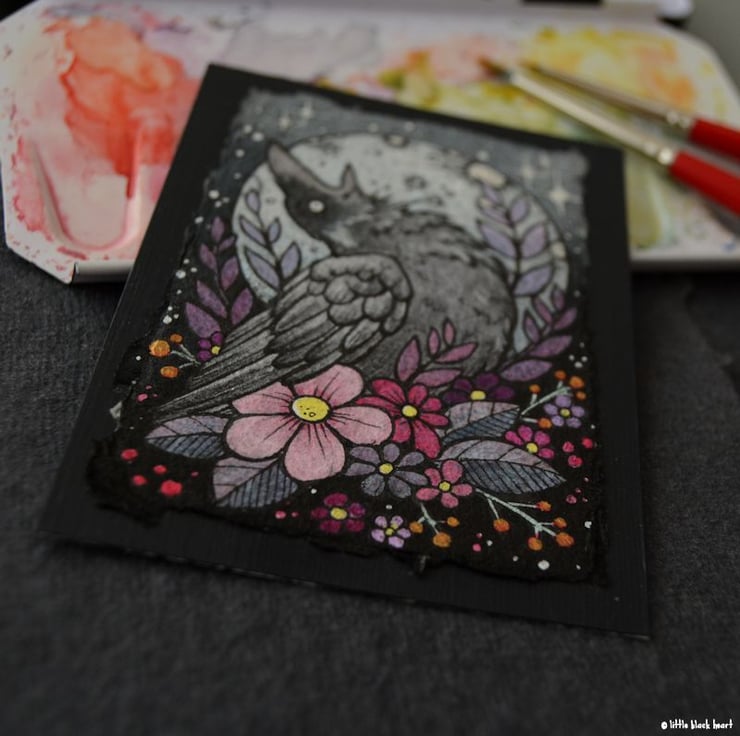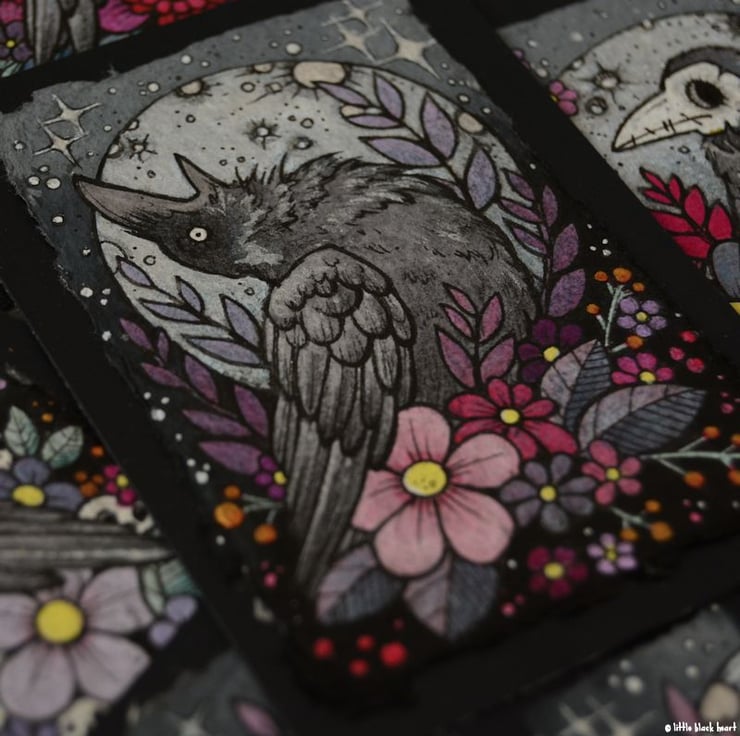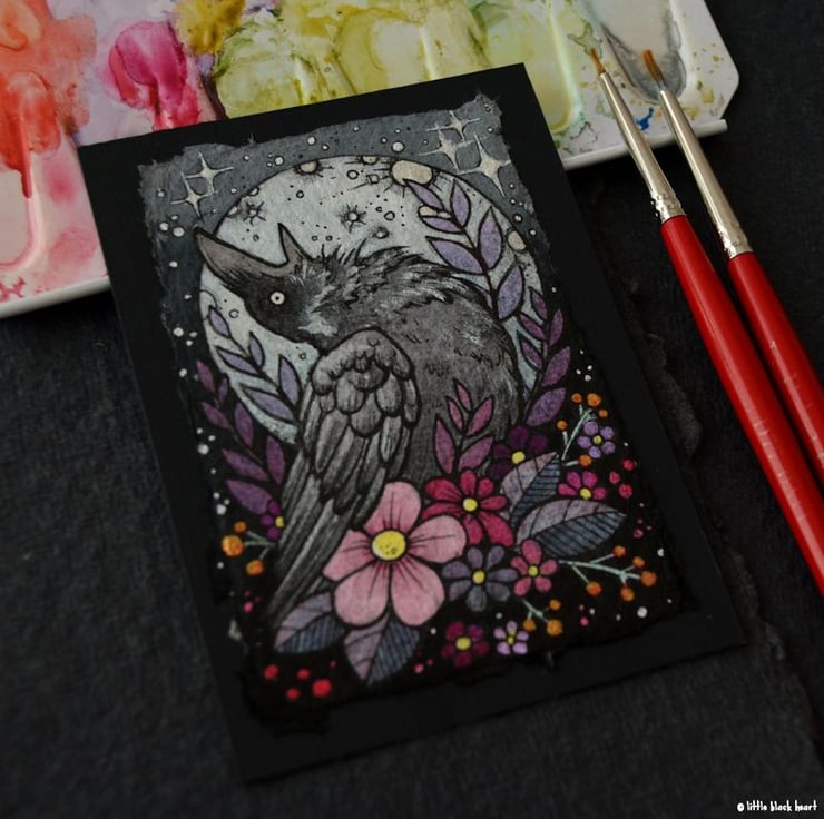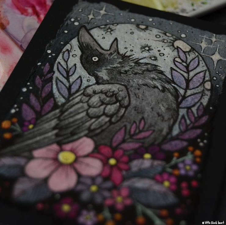this aceo is an original artwork, hand drawn with a tiny 0.05 nibbed pen, then coloured with ink, artists pens and watercolour paints, on indian khadi paper. khadi paper is handmade from recycled cotton rag, it has a lovely textured surface and deckled edges. i have then mounted the illustration onto 300gsm cardstock, hand painted with a paynes grey to create a dark surrounding edge/background.