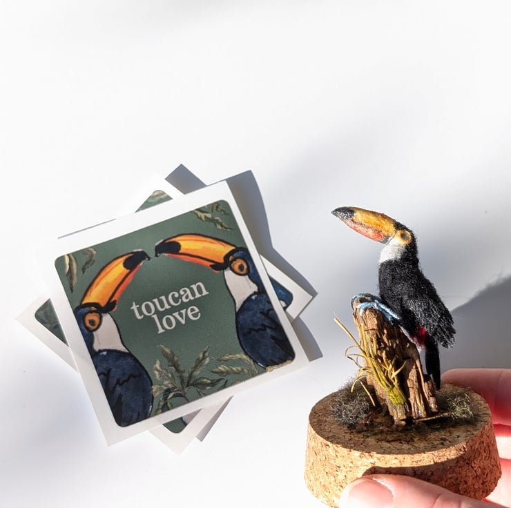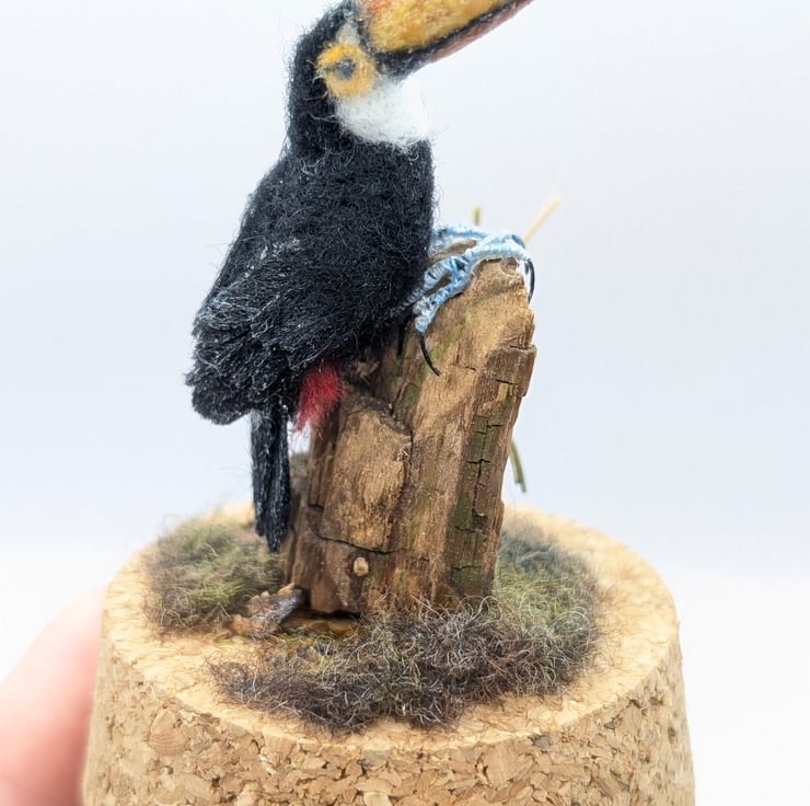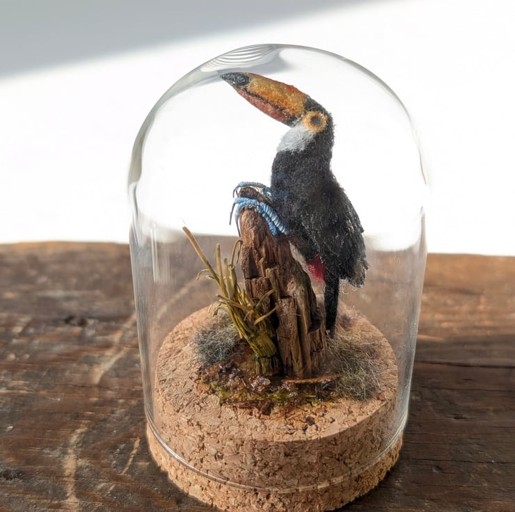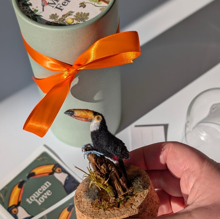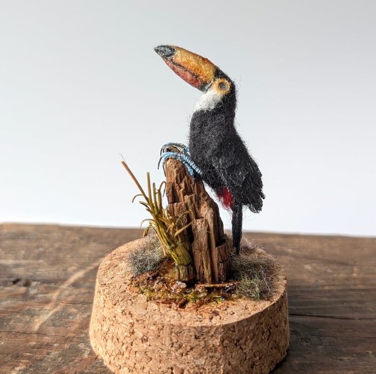 A collection of 5 utterly unique, limited edition tiny wool Toco Toucans in 1:12 scale natural habitat dioramas. A tiny bird perfectly formed to share your love with that special someone, be they bird lover, miniature collector or dollhouse enthusiast.