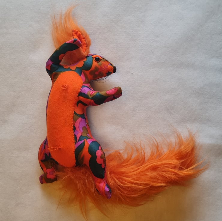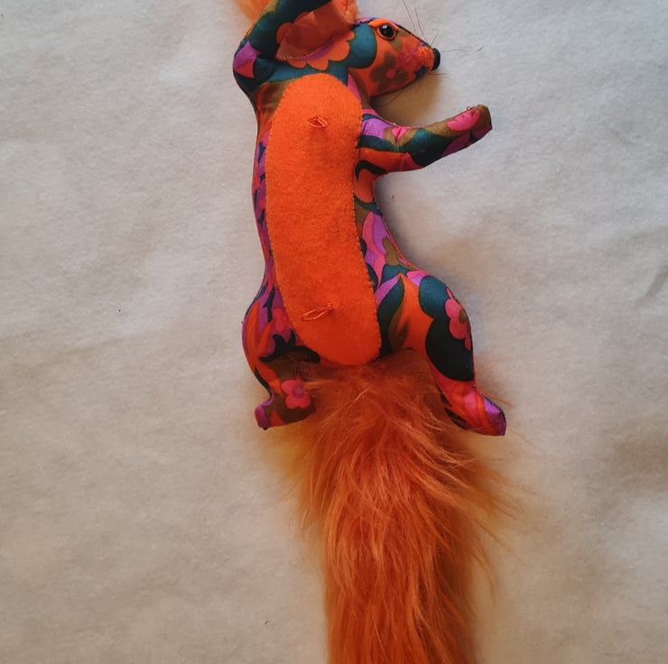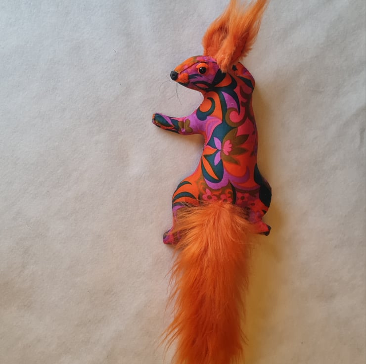 A lifesize faux squirrel I have handmade and covered in hand stitched vintage 1960s patterned fabric. She has ear tufts and a fluffy tail made from long faux fur.