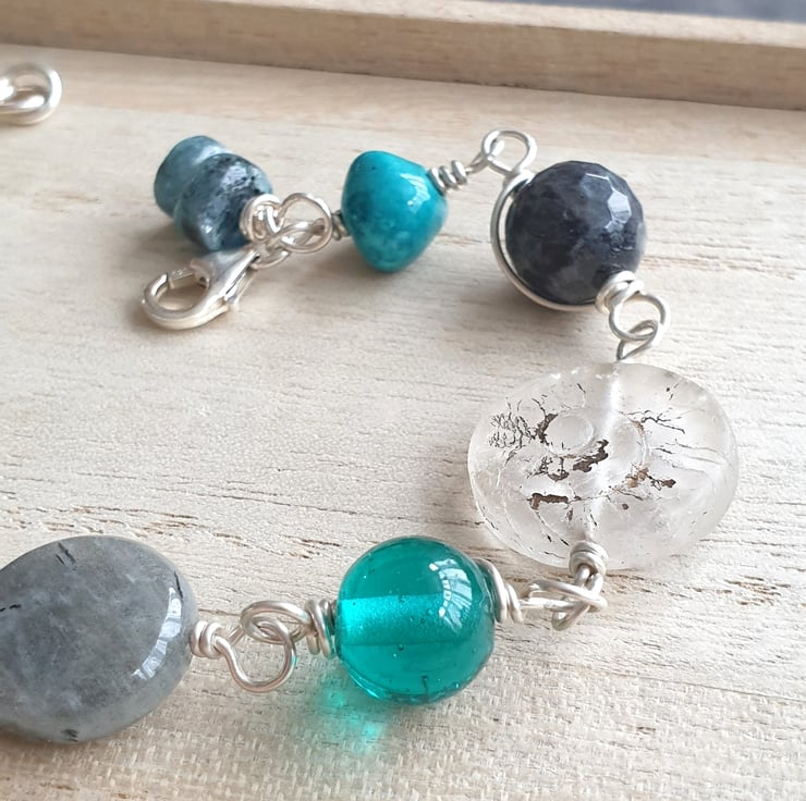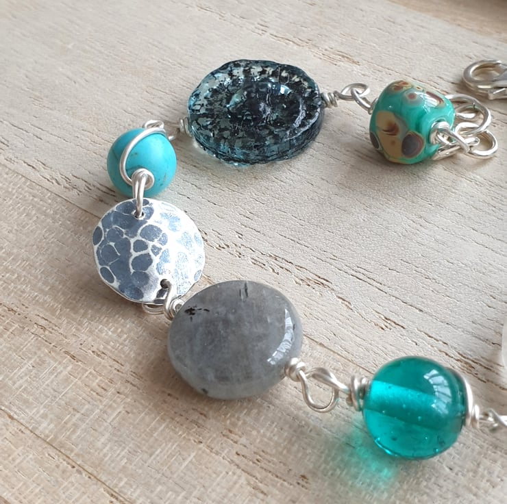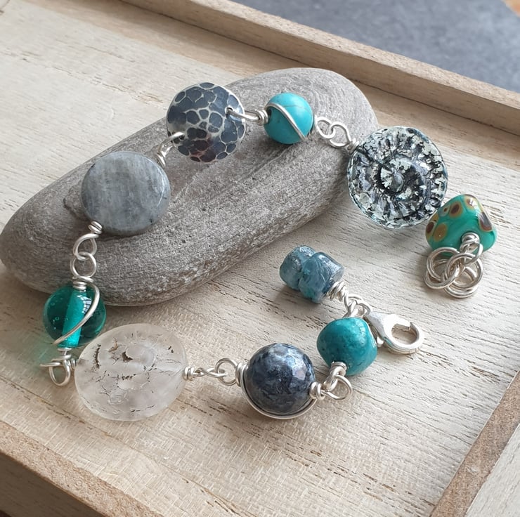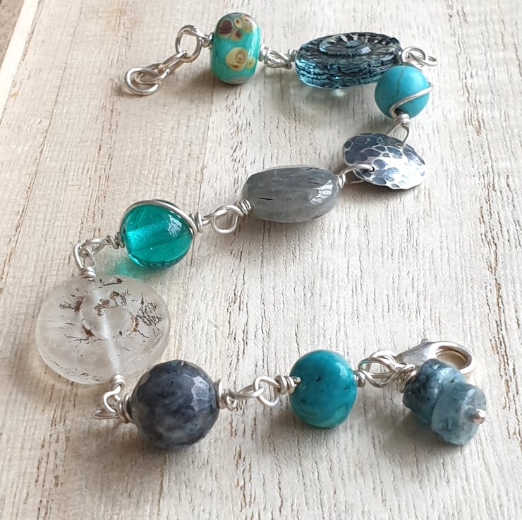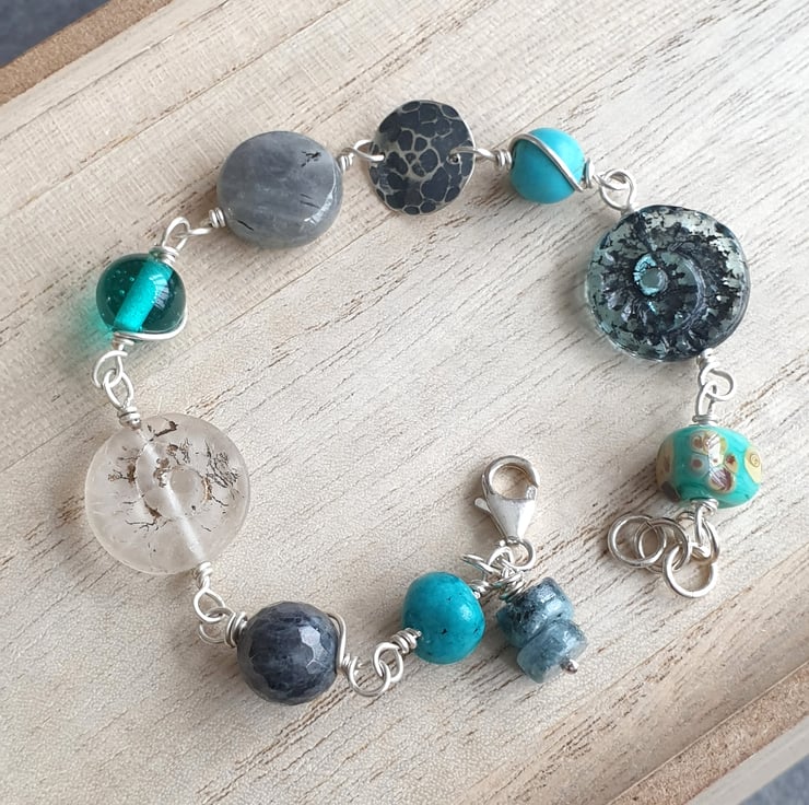 This bracelet is made from a selection of glass and gemstone beads in shades of grey, turquoise and frosted white, focusing on two flat glass ammonite beads - one in deep translucent grey blue and the other in frosted white with gold highlights. I have also included a hammered and oxidised silver disc, labradorite, kyanite and lampwork glass to this eclectic mix.