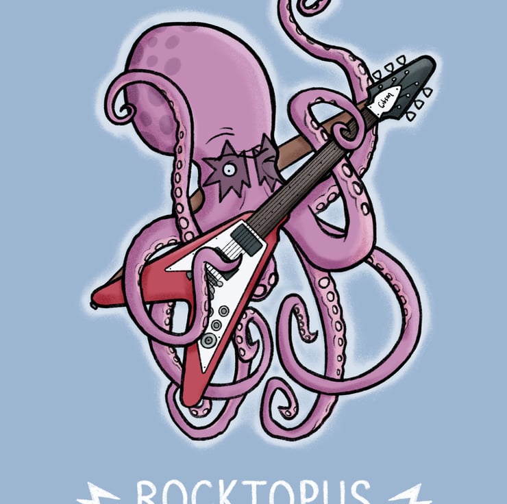 Featuring my original illustration 'Rocktopus', this pun-tastic greeting card is perfect for that special metalhead or octopus fan in your life.
