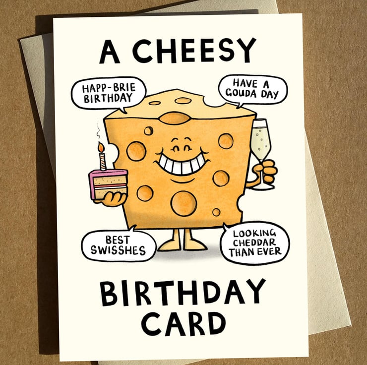 Featuring my original cartoon illustration, this corny cheese pun Birthday card is perfect for that special someone on their special day