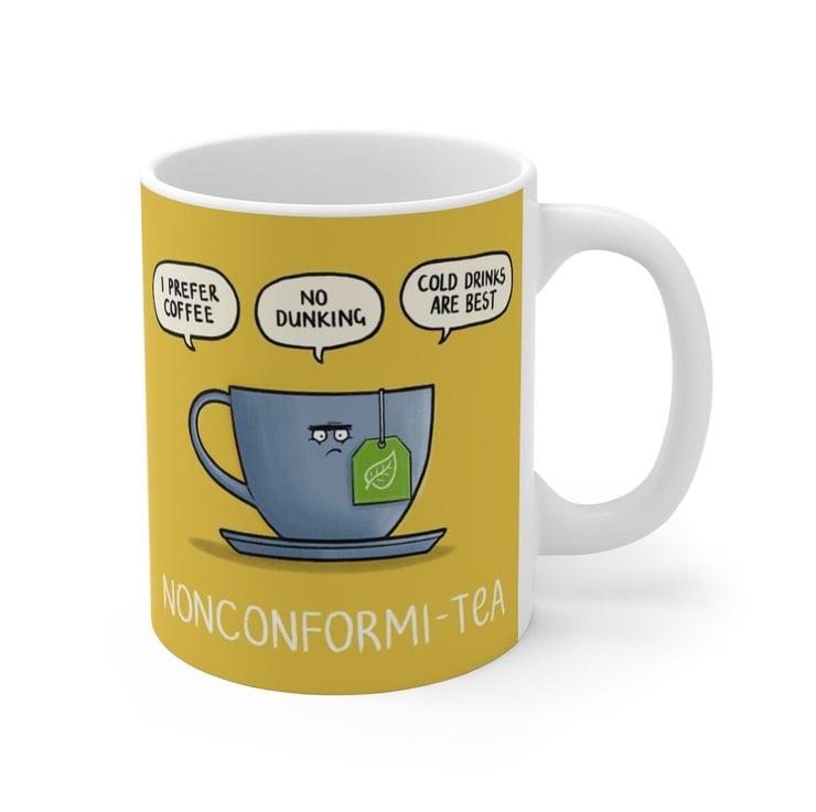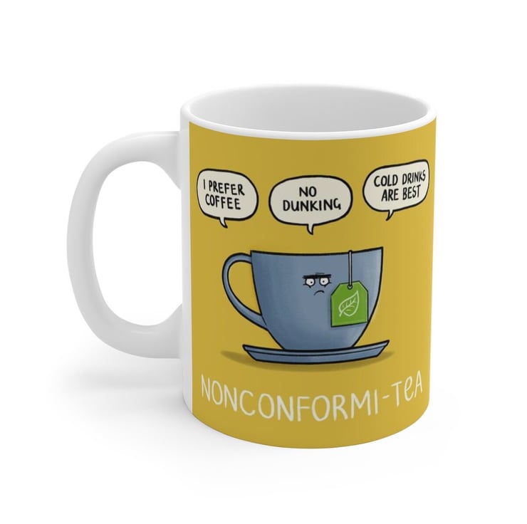A durable white, glossy ceramic mug featuring my original illustration 'Nonconformi-tea'.