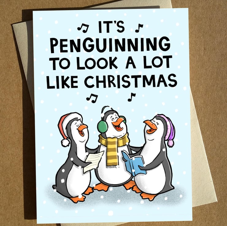 Punny Christmas Penguins card featuring my original cartoon illustration.
