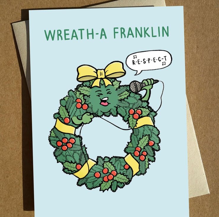 This punny Christmas card features my own original cartoon illustration "Wreath-a Franklin" - hand drawn and digitally finished.