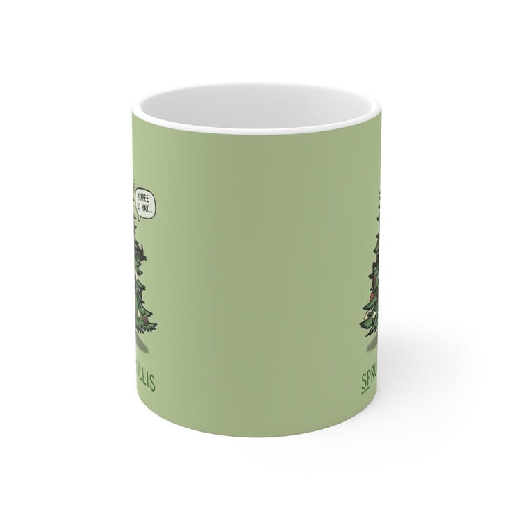 A durable white, glossy ceramic mug featuring my original 'Spruce Willis' illustration.