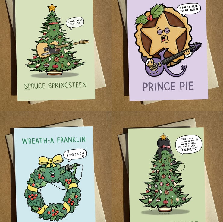 Set of 4 fun and exclusive festive greeting cards featuring music icon puns.