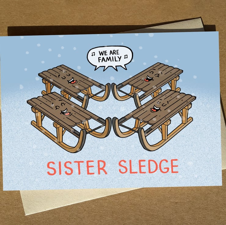 This punny Christmas card features my own original cartoon illustration "Sister Sledge" - hand drawn and digitally finished.