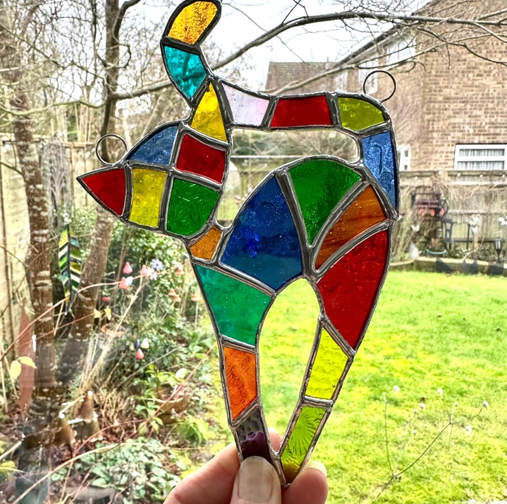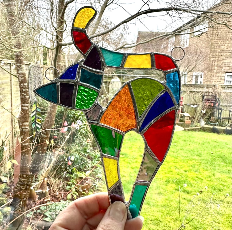 I have made this using a lovely mix of vibrantly coloured stained glass which has made a lovely combination for this cat and will add a great splash of colour to your window.