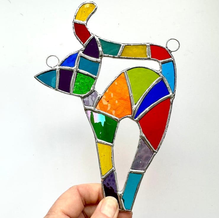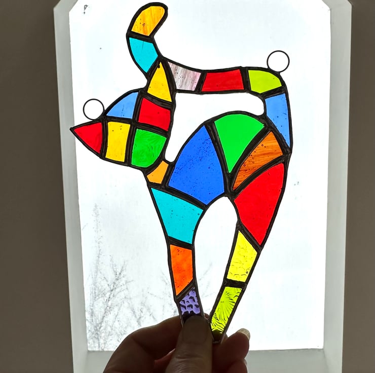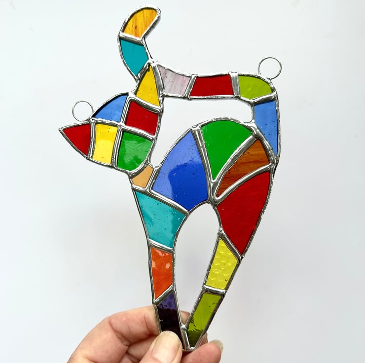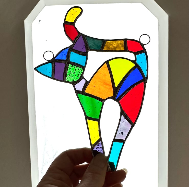 Patchwork cat made in beautiful stained glass by Carole’s Glass.
