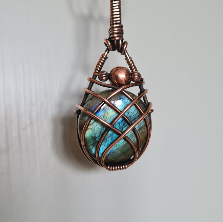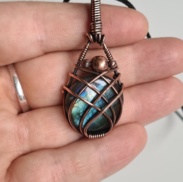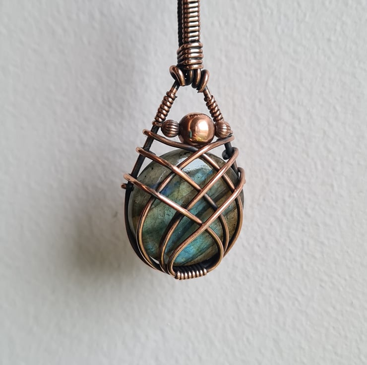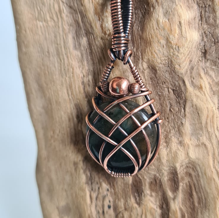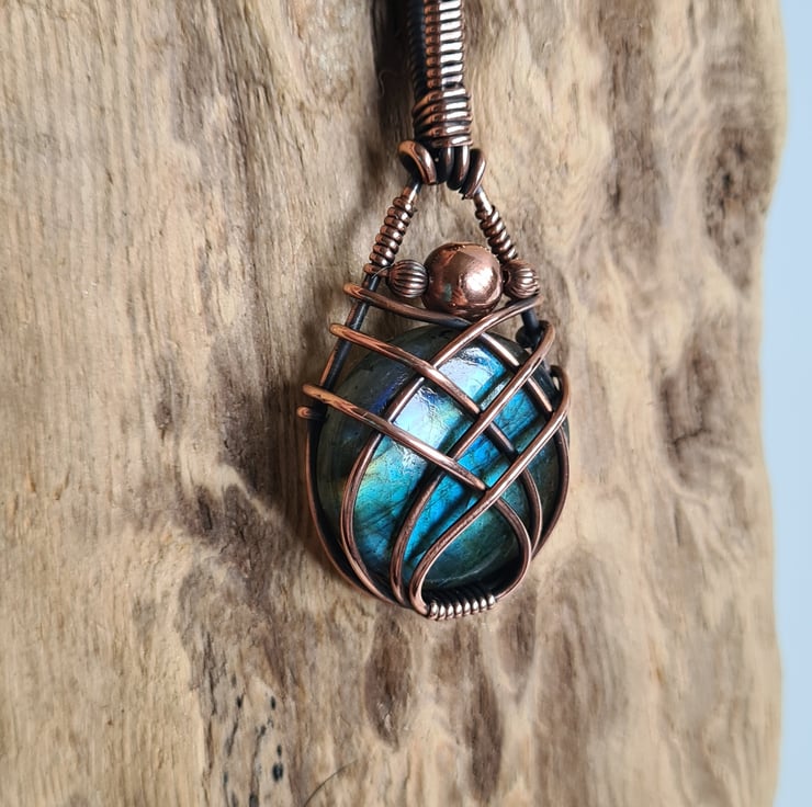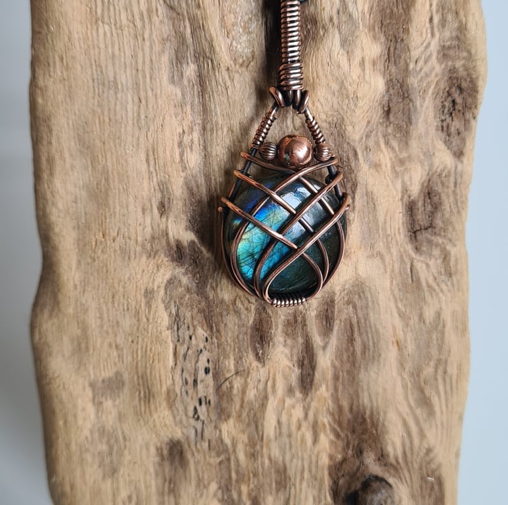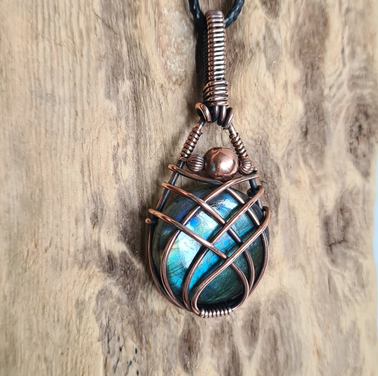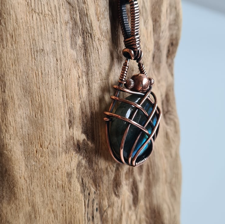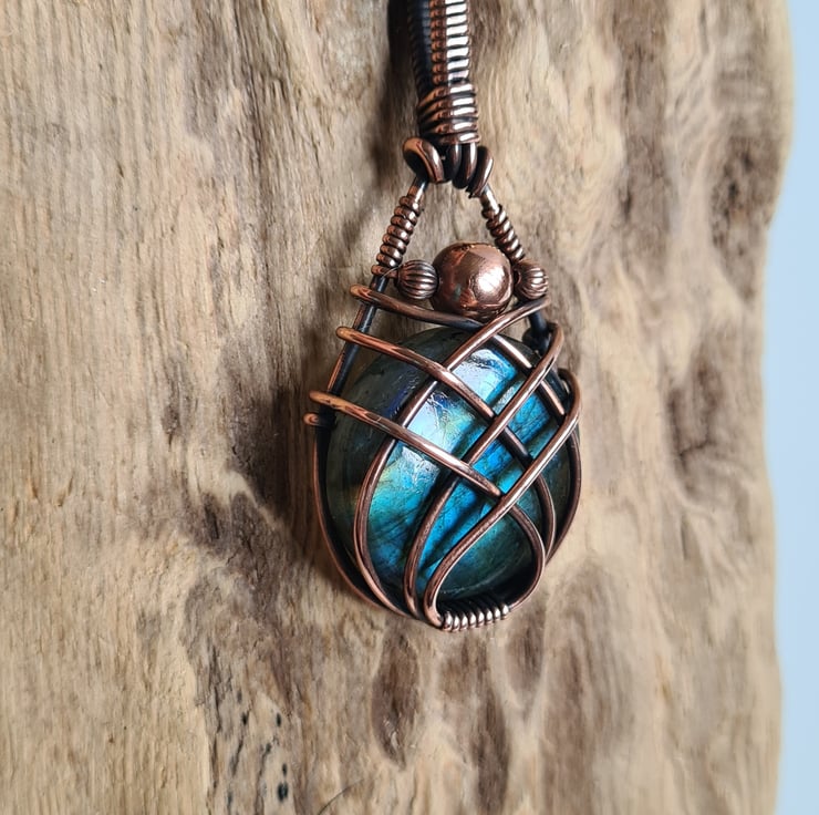 This gorgeous Natural Labradorite stone is a beautiful mix of dark blue colours and has a beautiful shimmer and shine. I have wrapped this stone with copper into this unique design and then antiqued and polished for the final effect.