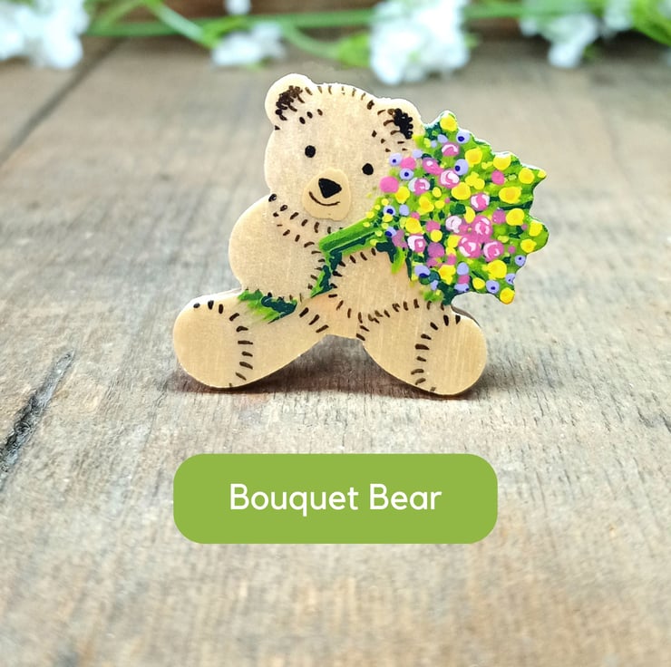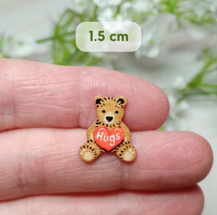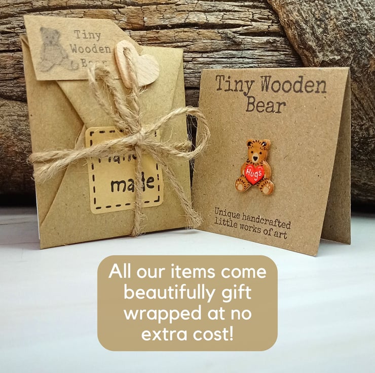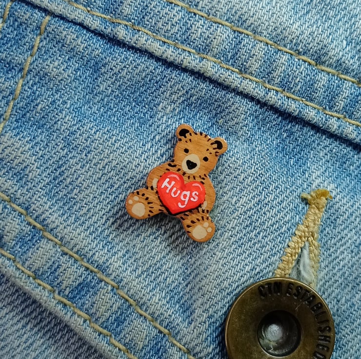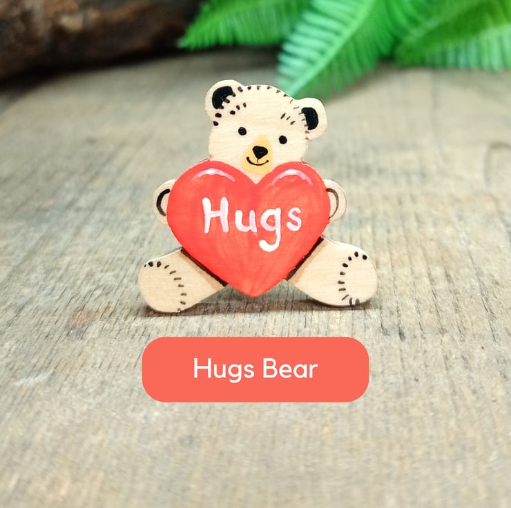 Looking for a thoughtful gift or a sweet pick-me-up? This handcrafted wooden teddy bear pin is a tiny token of love, designed to bring warmth and comfort wherever you go. Each miniature bear holds a red heart with "Hugs" painted on it—a gentle reminder that love and kindness are always close by.
