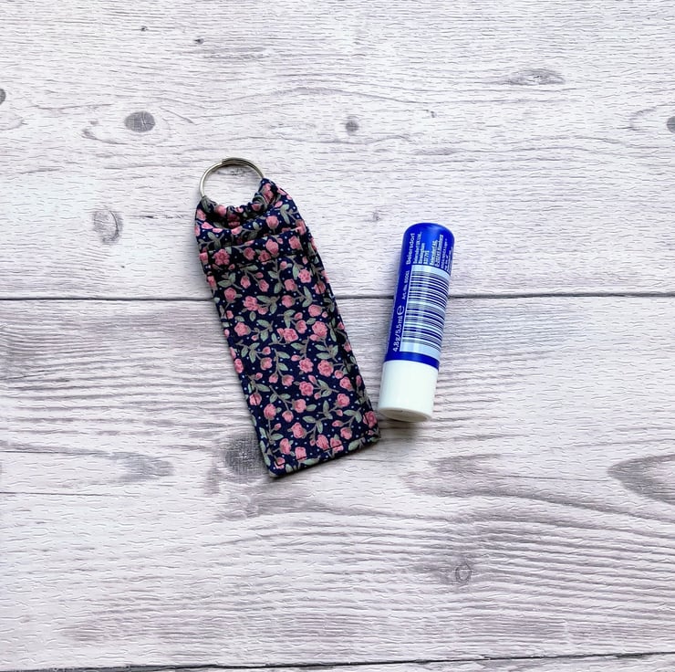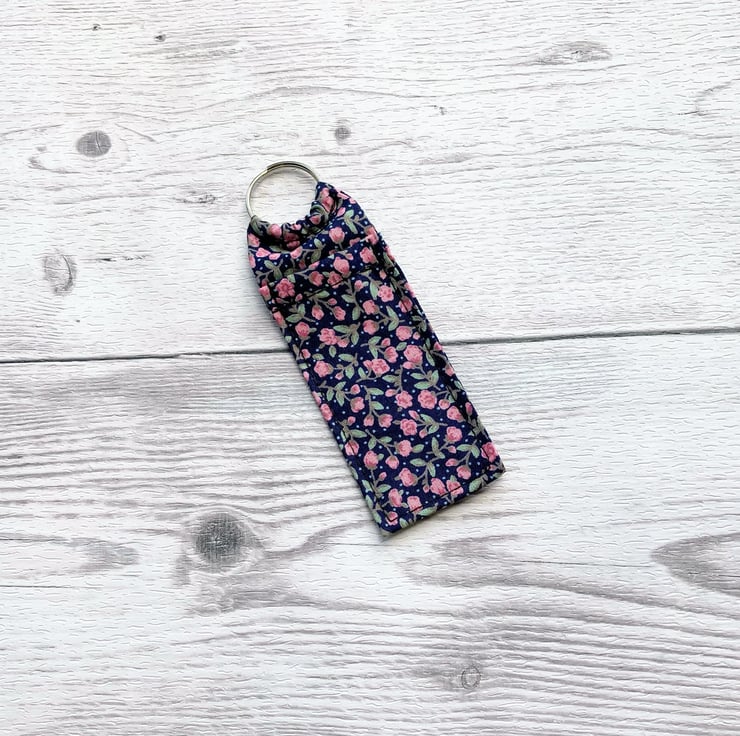 Lip balm cotton fabric keyring. Ditsy navy & pink.