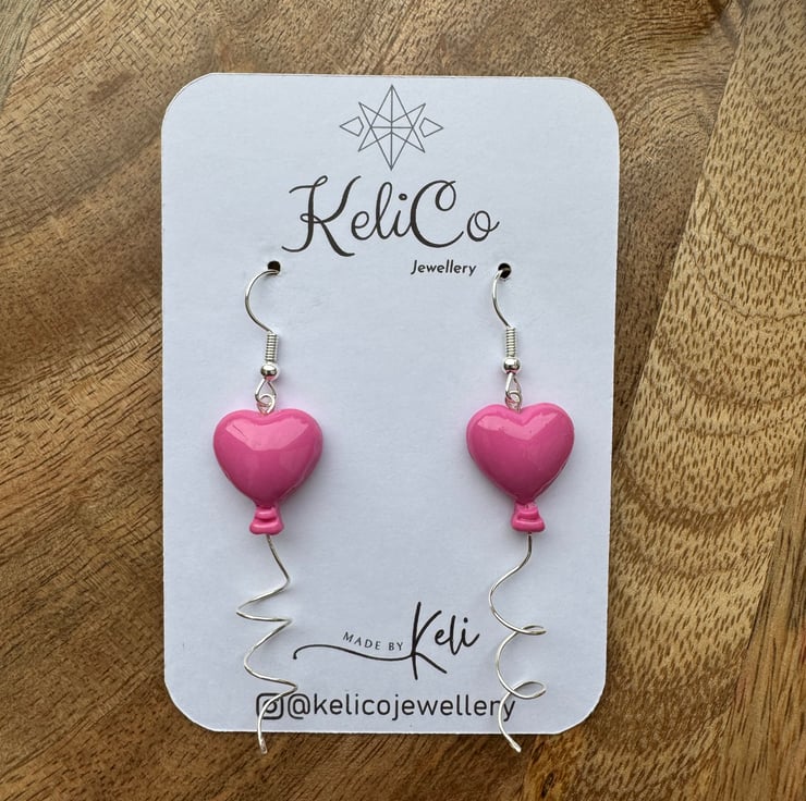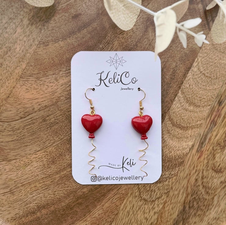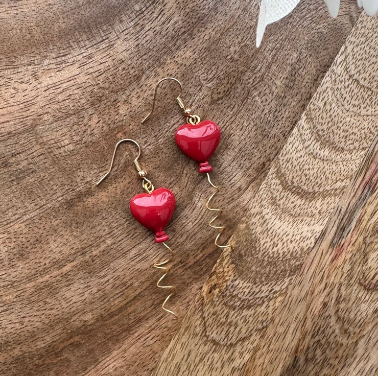 Gorgeous handmade, heart shaped balloon earrings, finished with a metal “string”. Available in red with gold coloured hooks and pink with silver coloured hooks. Please drop a message with your order stating your colour preference.