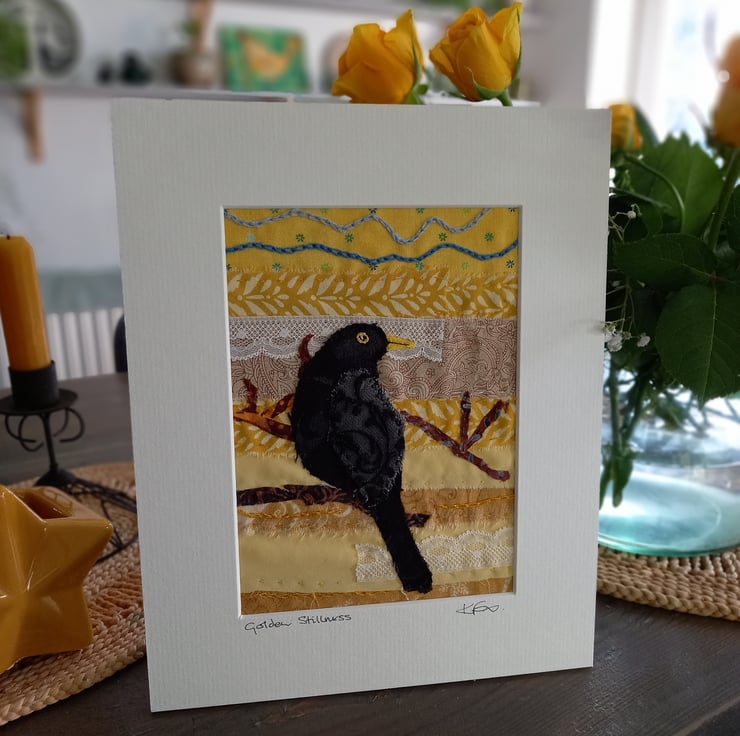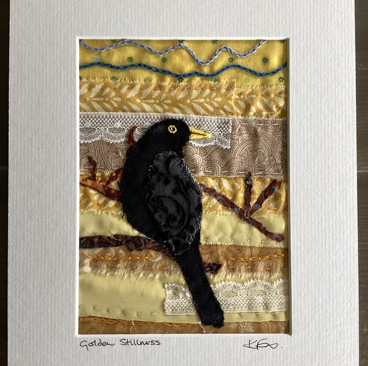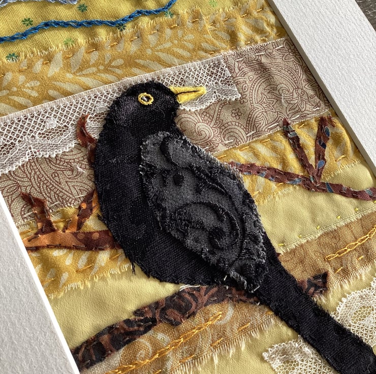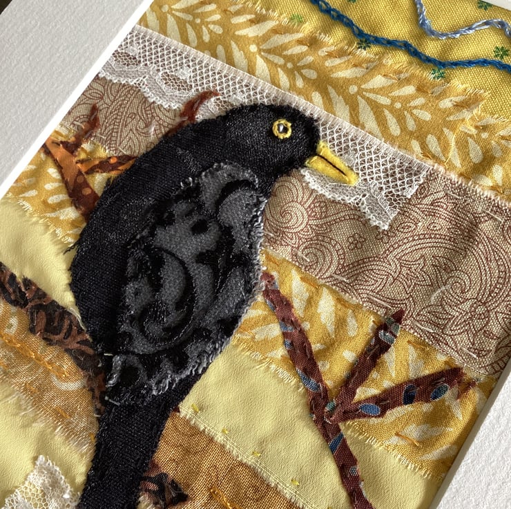 This hand stitched textile artwork captures the quiet beauty of a blackbird perched among golden hues.