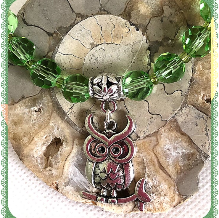 OOAK Owl Bangle style bracelet created using this Tibetan silver owl charm & connector with faceted green glass beads threaded in to stainless steel memory wire bracelet. Lobster clasp extension chain with small owl charm. Nickel free. Adult size wrist adjustable