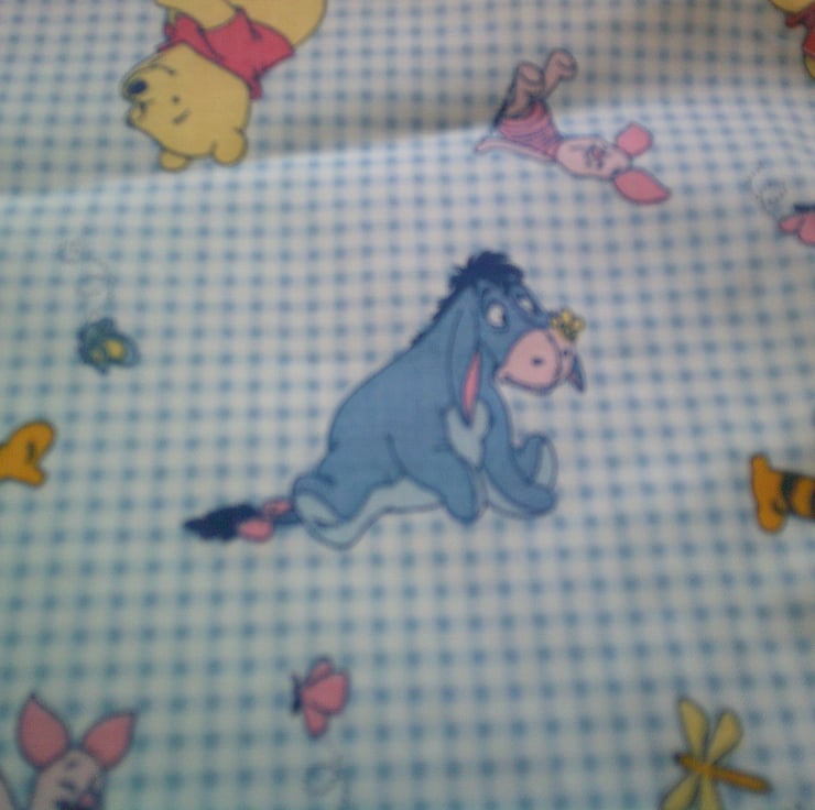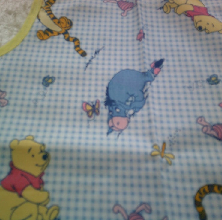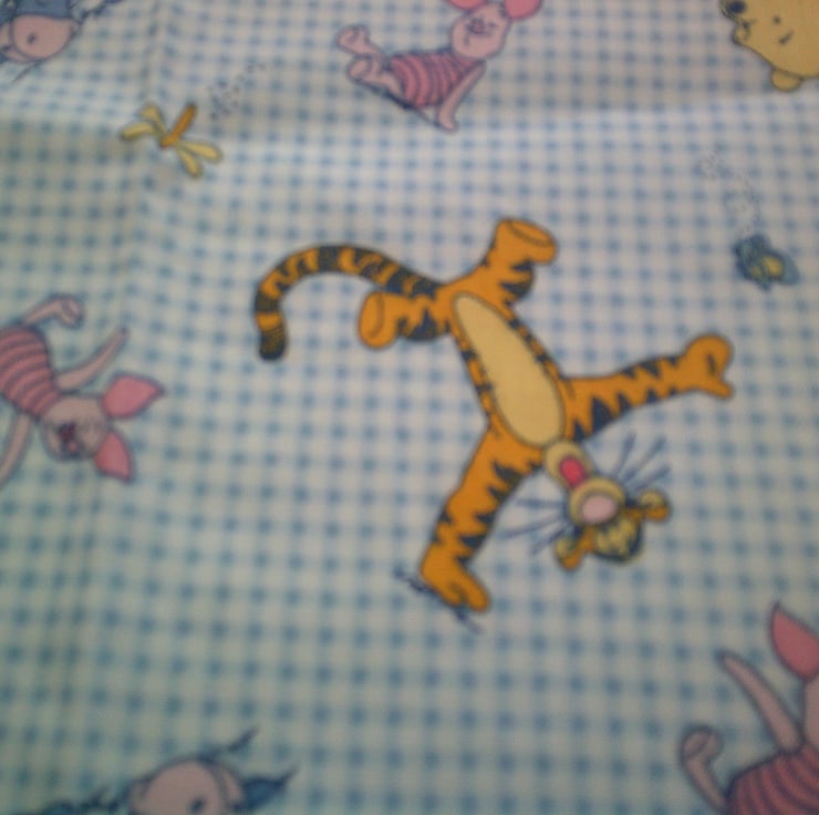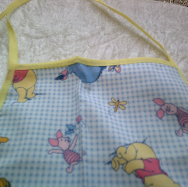 The fabric used has a design of Winnie The Pooh, Tigger, Eeyore and Piglet on a blue and white checked background and is edged with a contrasting yellow bias binding.