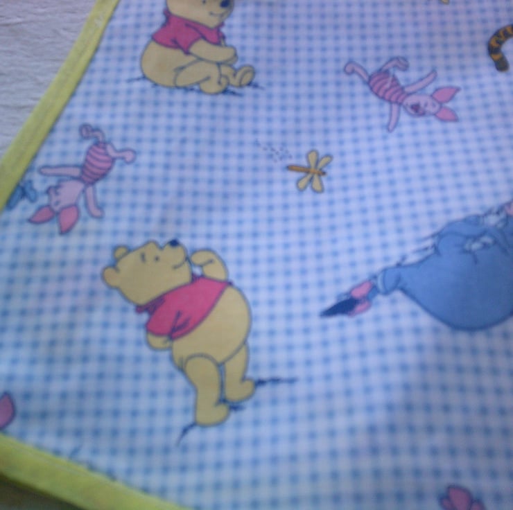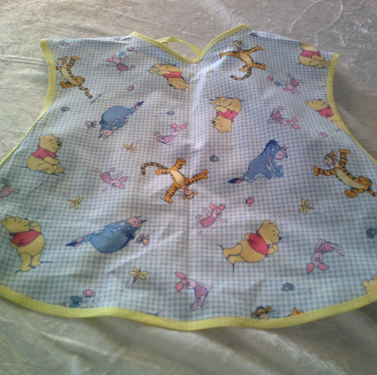 The design features Winnie the Pooh, Tigger, Eeyore and Piglet on a blue & White checked backgroiund and is edged with yellow bias binding.