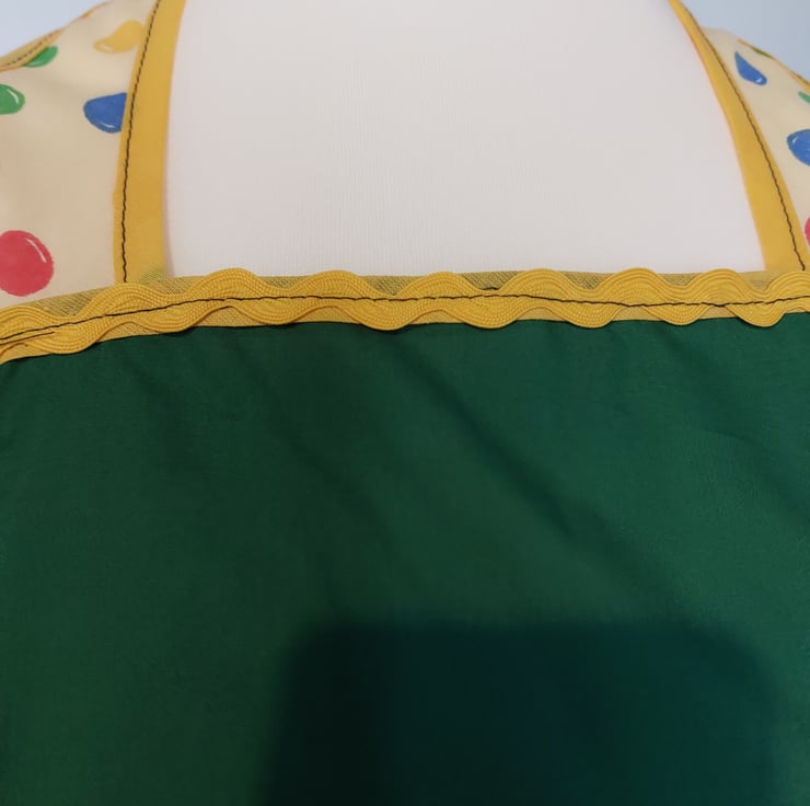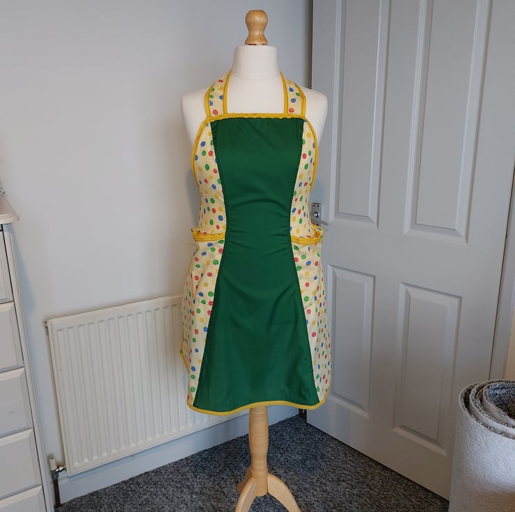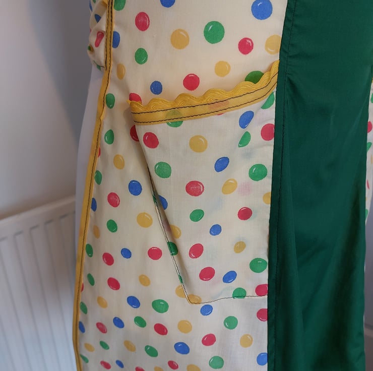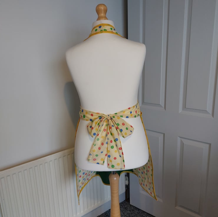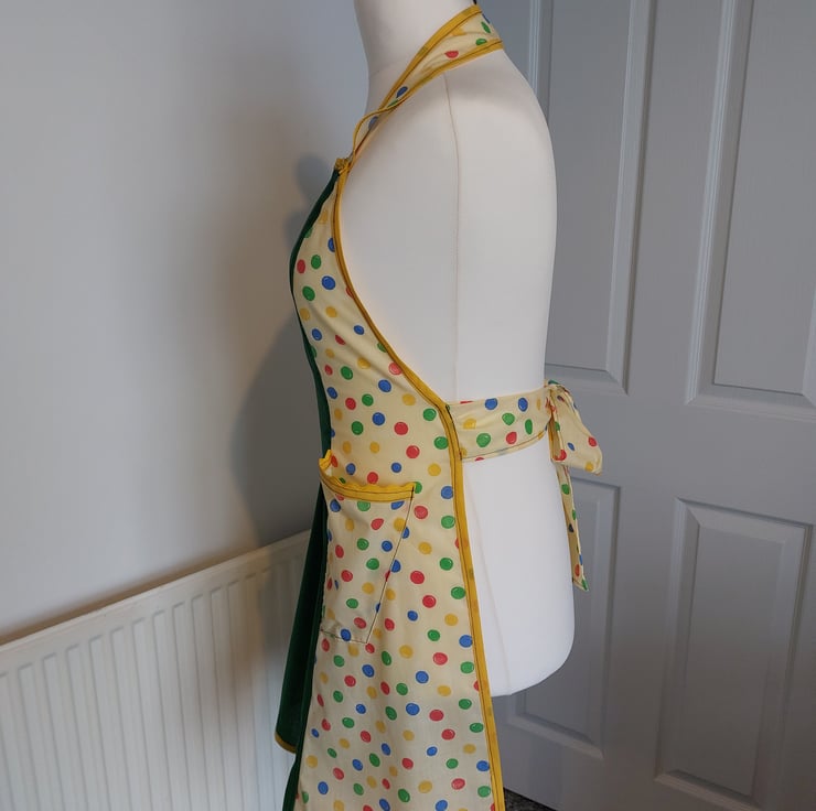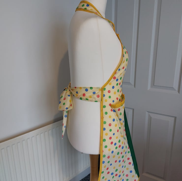 Upcycled 1940's style apron using a vintage spotty fabric. Apron is edged with a yellow bias tape and yellow ric-rac, stitched with green thread