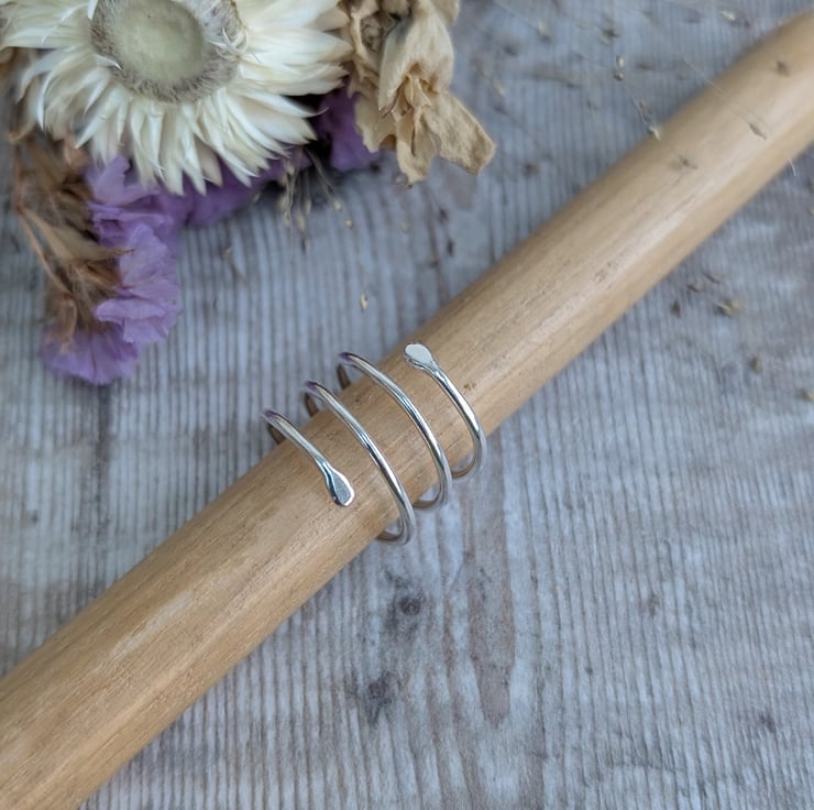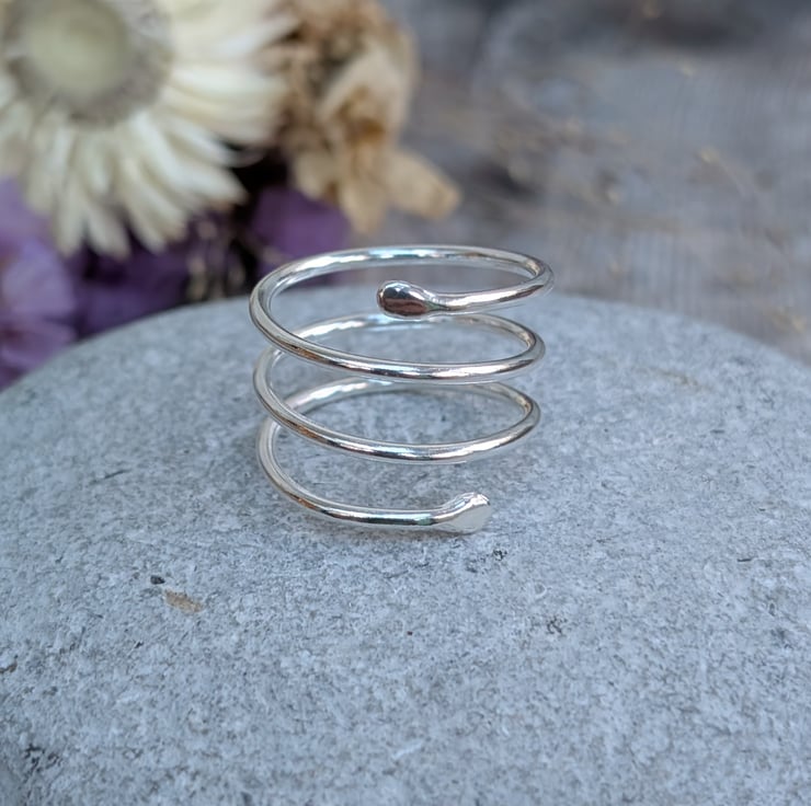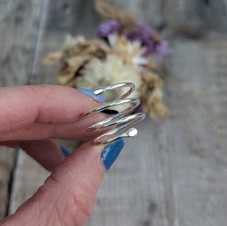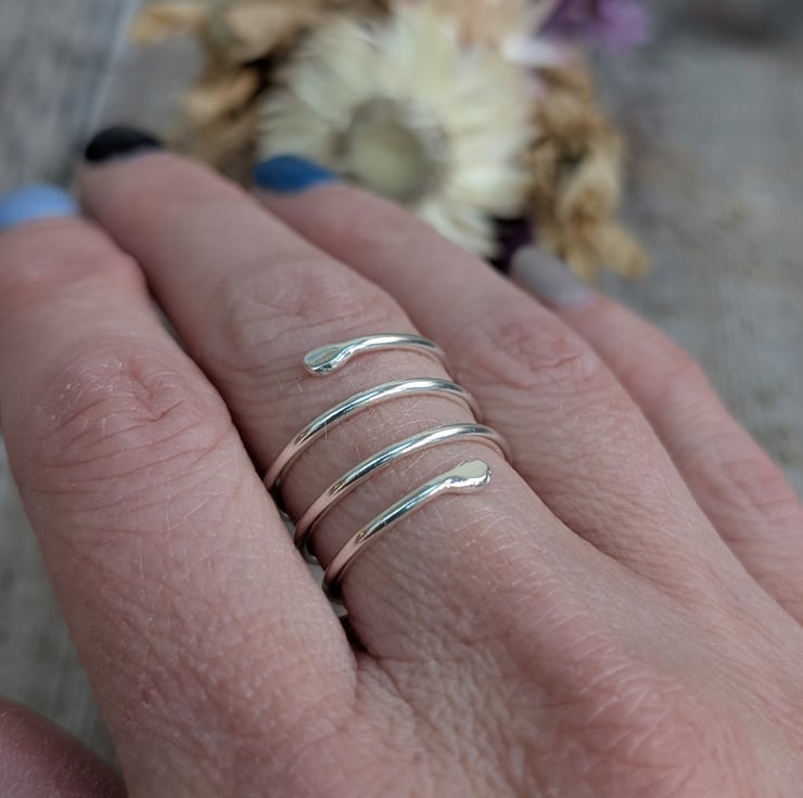 This delicate wrap ring is handmade from recycled sterling silver, featuring a flowing spiral design that curves elegantly around the finger. The smooth, polished silver catches the light, while the tapered ends add a subtle organic touch. Lightweight and comfortable, it's perfect for everyday wear, whether worn alone or stacked with other rings.