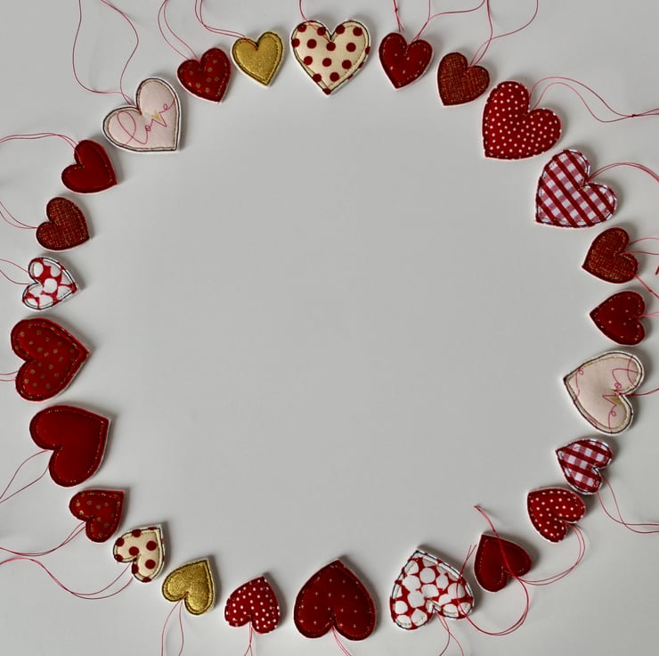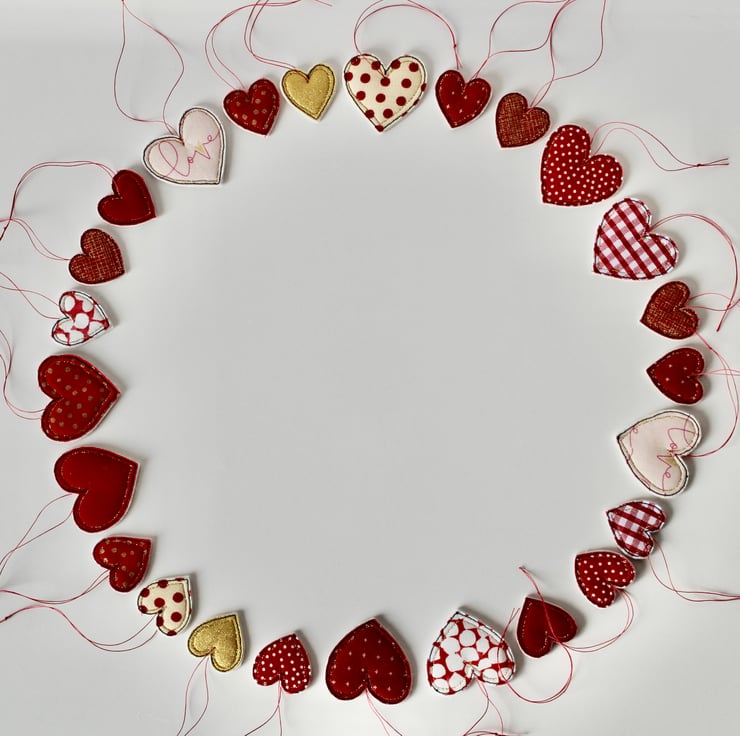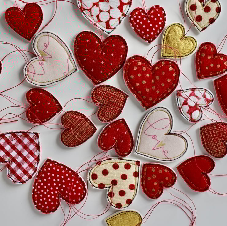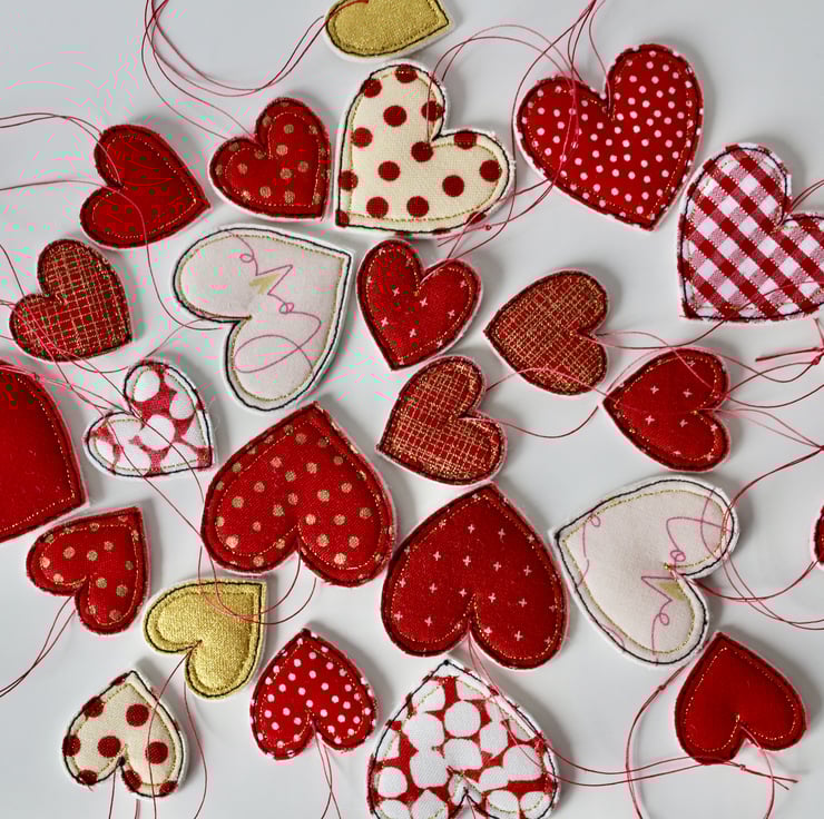 The larger heart measures approximately 4cm by 4cm and the collection you will receive will differ slightly from the photographed one in terms of heart size and fabric used.