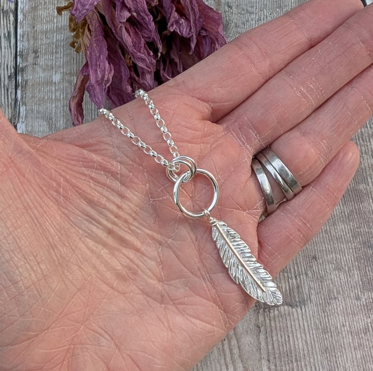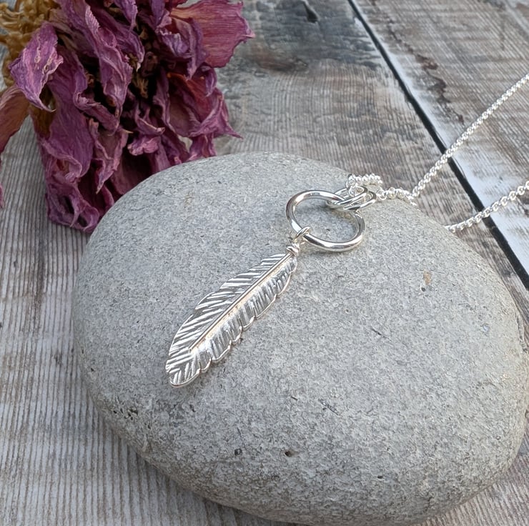 This elegant necklace features a finely detailed hand cut silver feather, delicately suspended from a polished ring. Handmade in Bristol, UK, using recycled silver, this piece embodies both craftsmanship and sustainability. The feather's intricate texture contrasts beautifully with the smooth ring, creating a harmonious balance of design elements. The long chain length makes it perfect for layering or wearing solo as a statement piece.