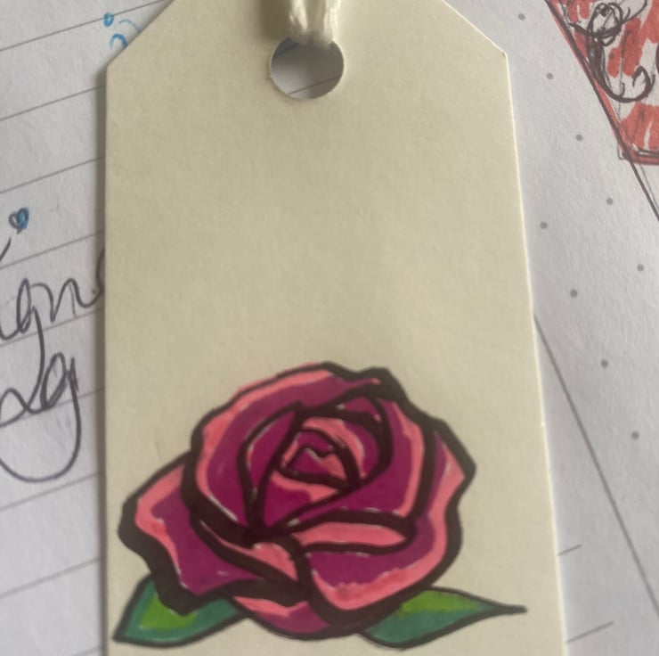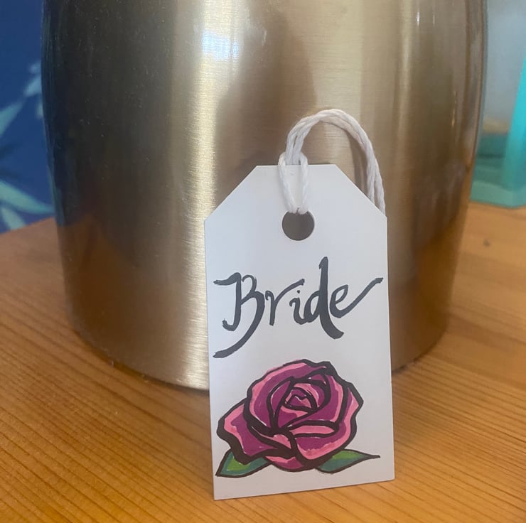 Hand drawn Rose wedding place card on luggage label, example - can be any colours.