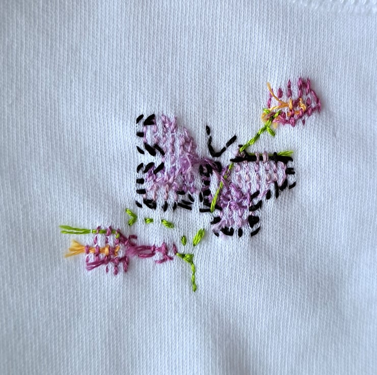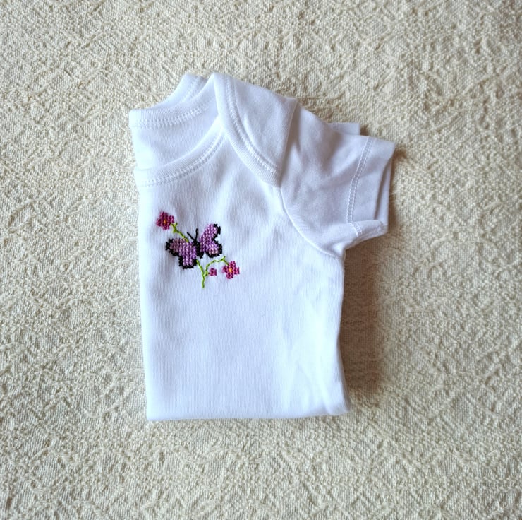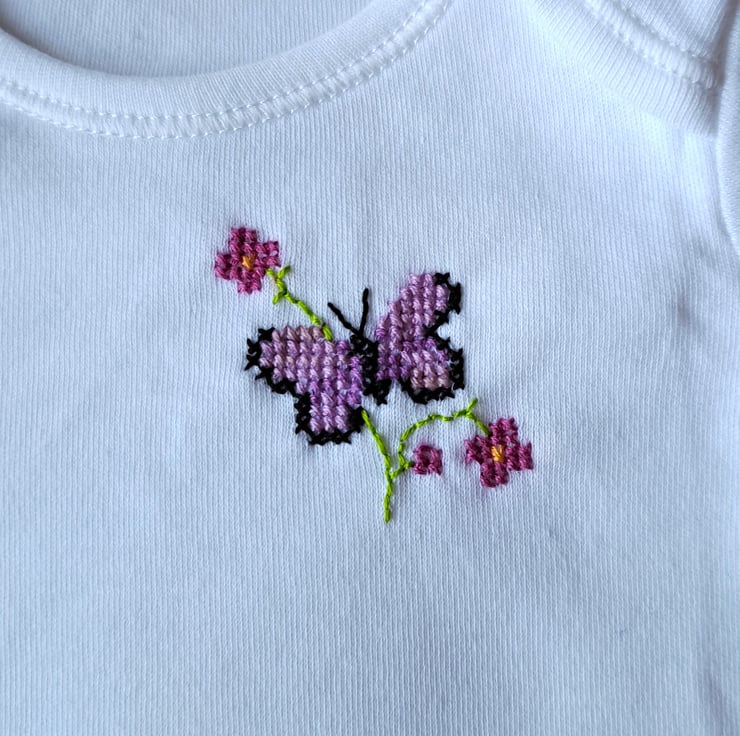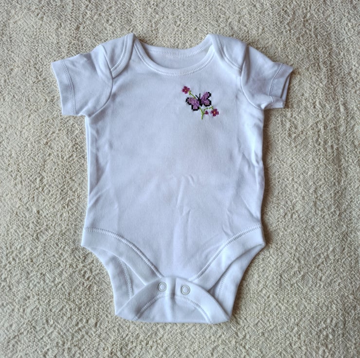 I have made this soft white cotton baby vest very feminine by hand embroidering a pink butterfly visiting toning pink flowers on the left front. The vest/onesie has an envelope neck, short sleeves and two press studs between the leg openings. As I never use a permanent backing material when hand embroidering kids' clothing, there is nothing inside this garment to irritate your baby's skin. It is machine washable.