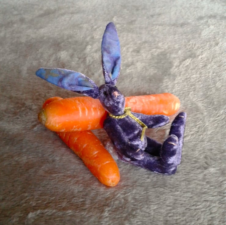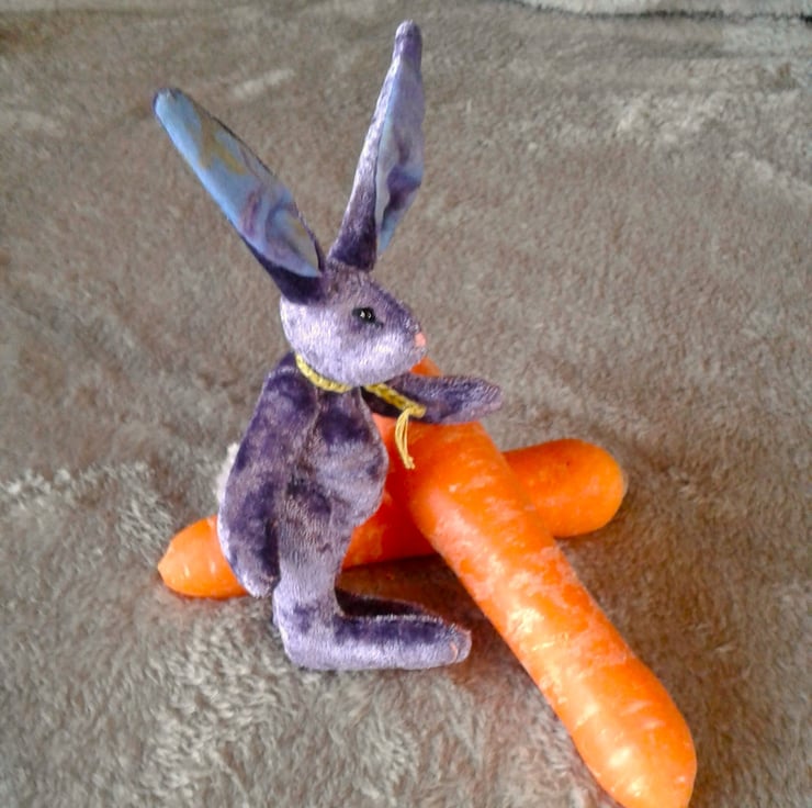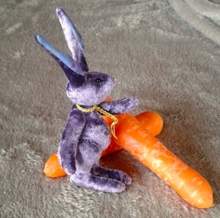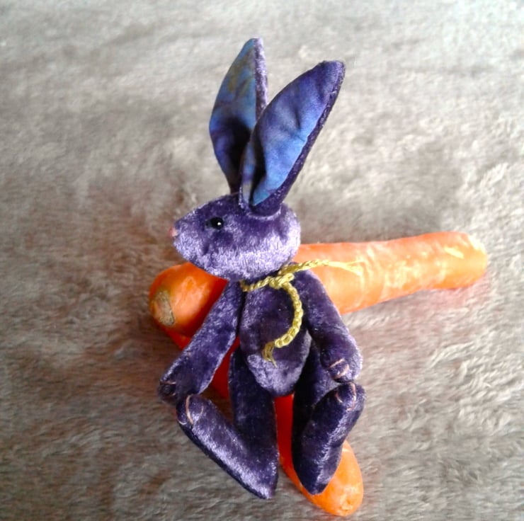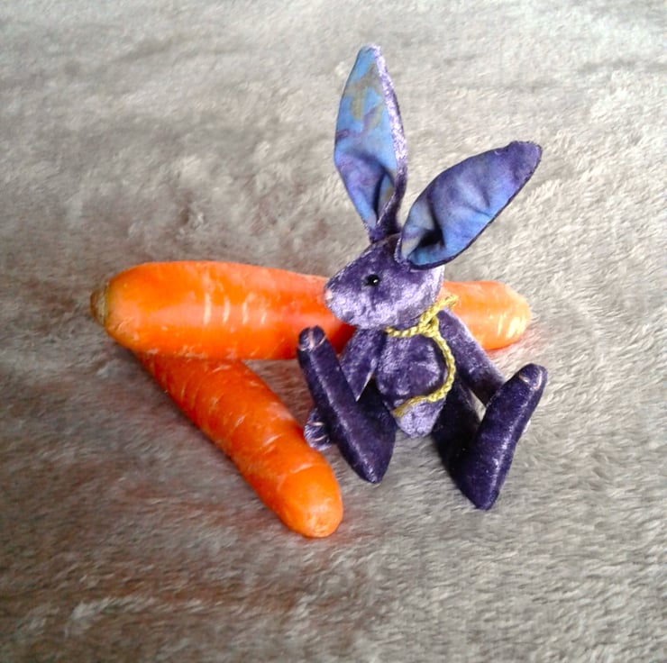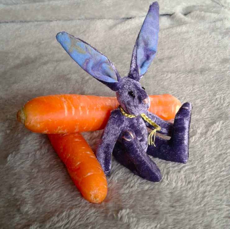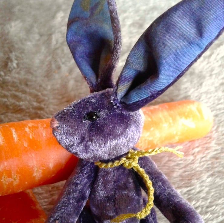 Rhubarb is 6 inches tall although his ears measure 2 inches so he is still not a big bunny. He has been hand stitched from a piece of purple crushed velvet fabric with cotton lined ears in a blue tie dye effect. Thread jointed all round so fully mobile Rhubarb is exploring the carrot patch and definitely in need of a lie down.