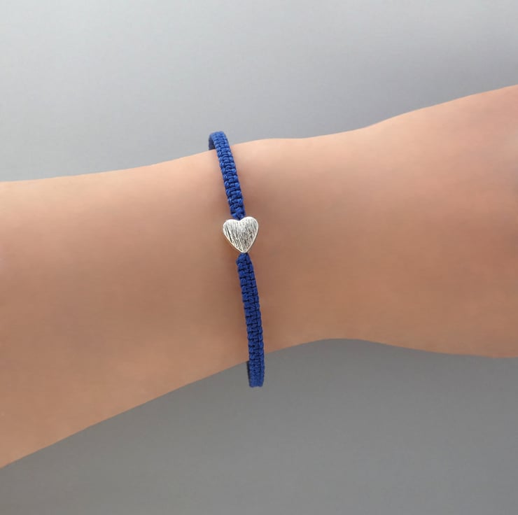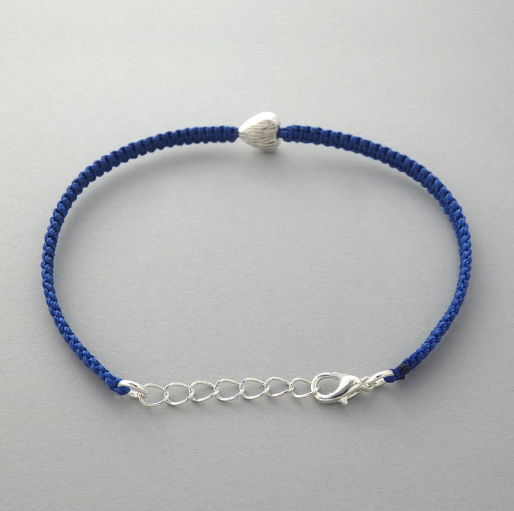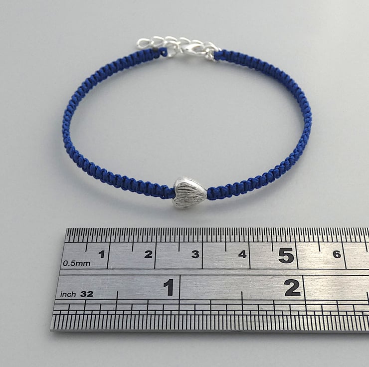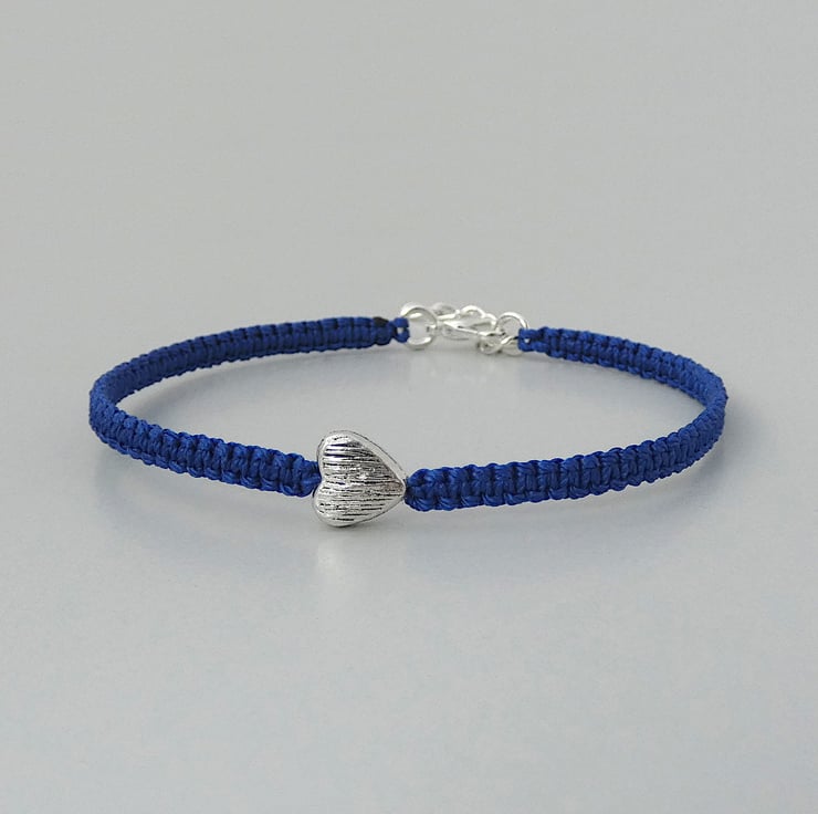 Royal blue nylon macramé bracelet with a silver plated textured heart charm. The bracelet is 7" long and can be extended up to 8" using the extender chain on the end of the bracelet. This makes a perfect gift for a loved one when you do not know the exact wrist size of your recipient.