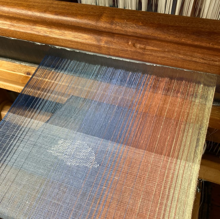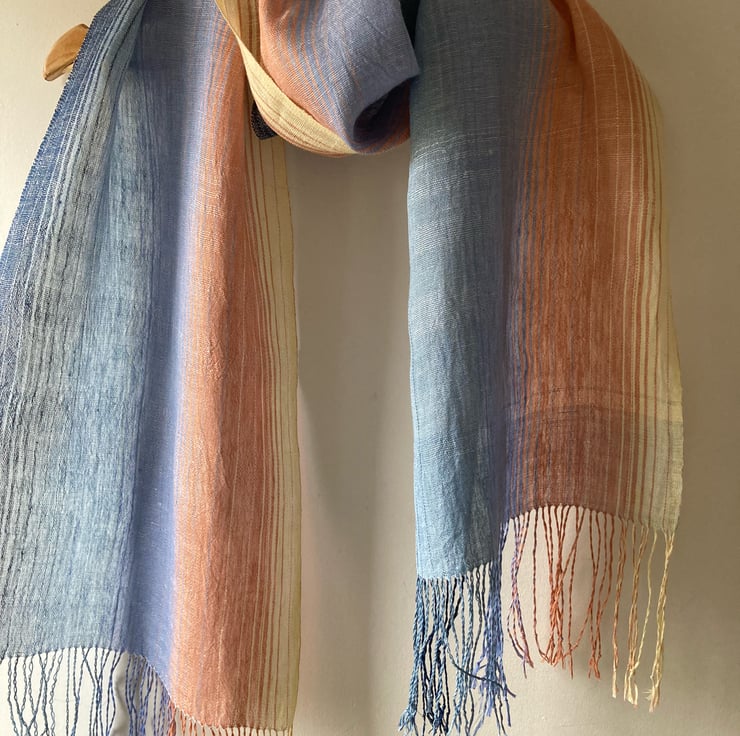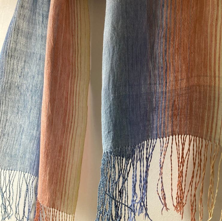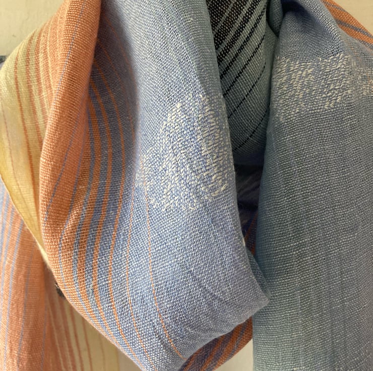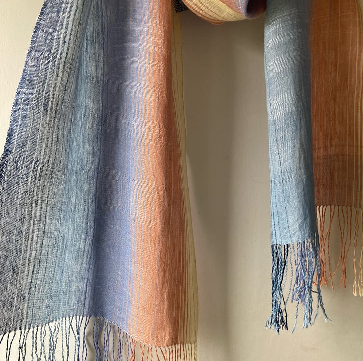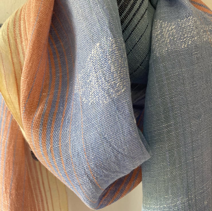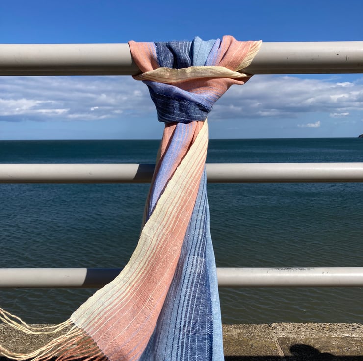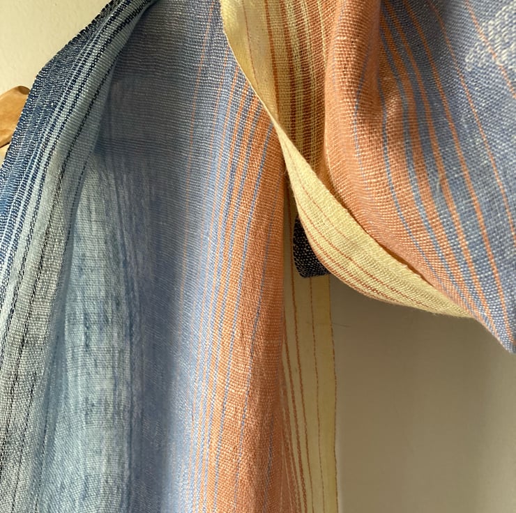 A handwoven scarf in 5 shades of very fine linen wound with a Fibonacci gradient. Created in response to sky and sea in Robin Hood’s Bay, the scarf is inlaid with an intricate advancing twill to form random clouds. The opposite end features a subtle Fibonacci gradient in the weft suggesting the perspective in the waves and a horizon line. Traditionally beetled and finished with a steam press to create a supple and very light drape.