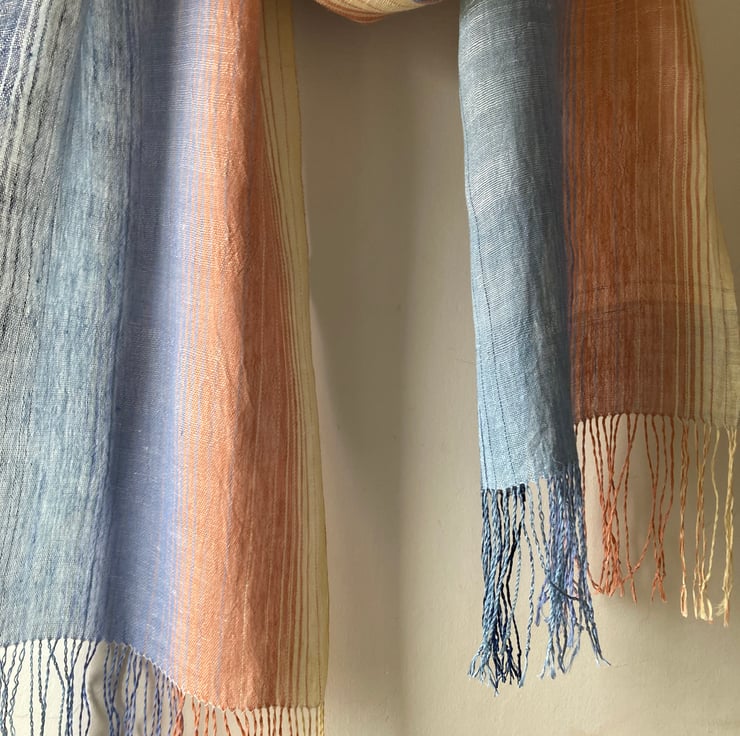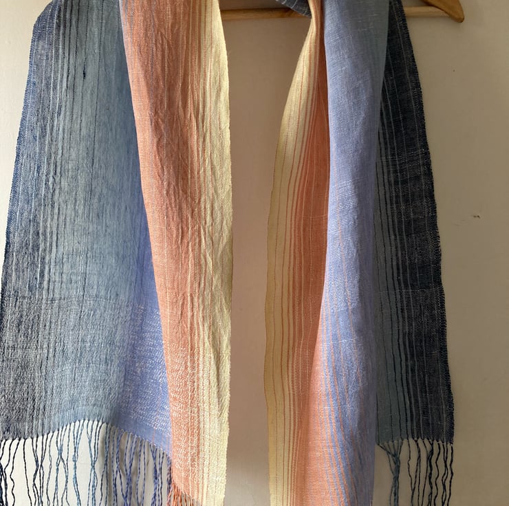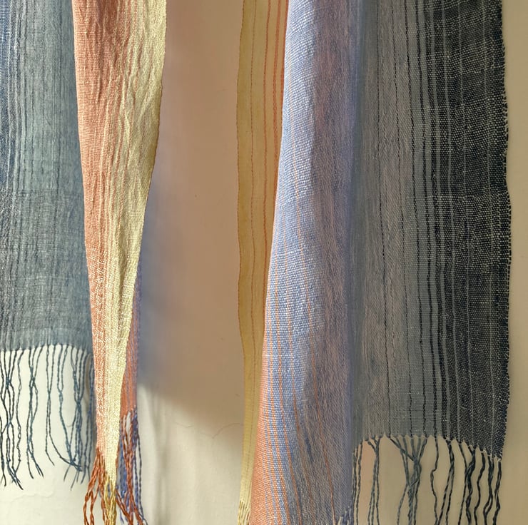 A handwoven scarf in 5 shades of very fine linen wound with a Fibonacci gradient. Created in response to sky and sea in Robin Hood’s Bay, the scarf features an intricate advancing twill to form random waves. The opposite end features a subtle Fibonacci gradient in the weft suggesting the perspective in the waves and a horizon line. Traditionally beetled and finished with a steam press to create a supple and very light drape.