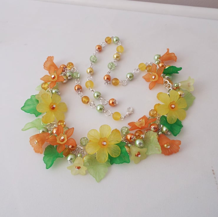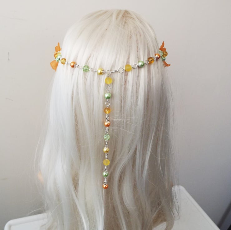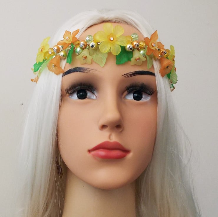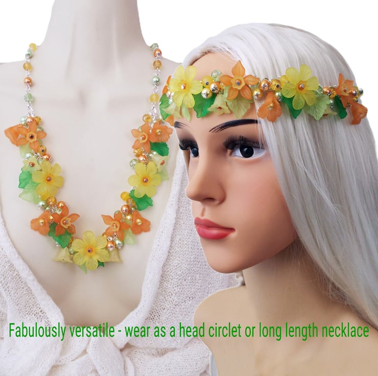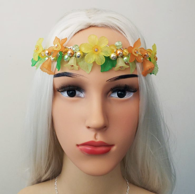 Stunning versatile flower headpiece that can also be worn as a necklace. A beautiful array of Lucite & acrylic yellow, orange & green flowers & leaves & a myriad of gorgeous glass beads & pearls each individually hand wired on to a silver plated chain. Finished with a beaded extender chain to the back & fastens with a lobster claw clasp.