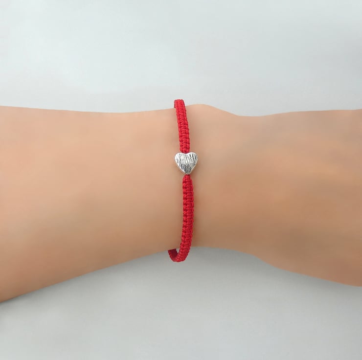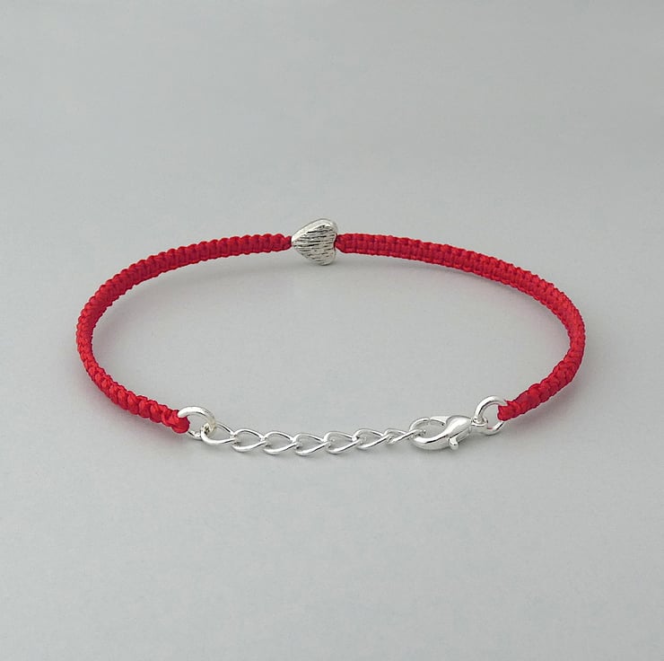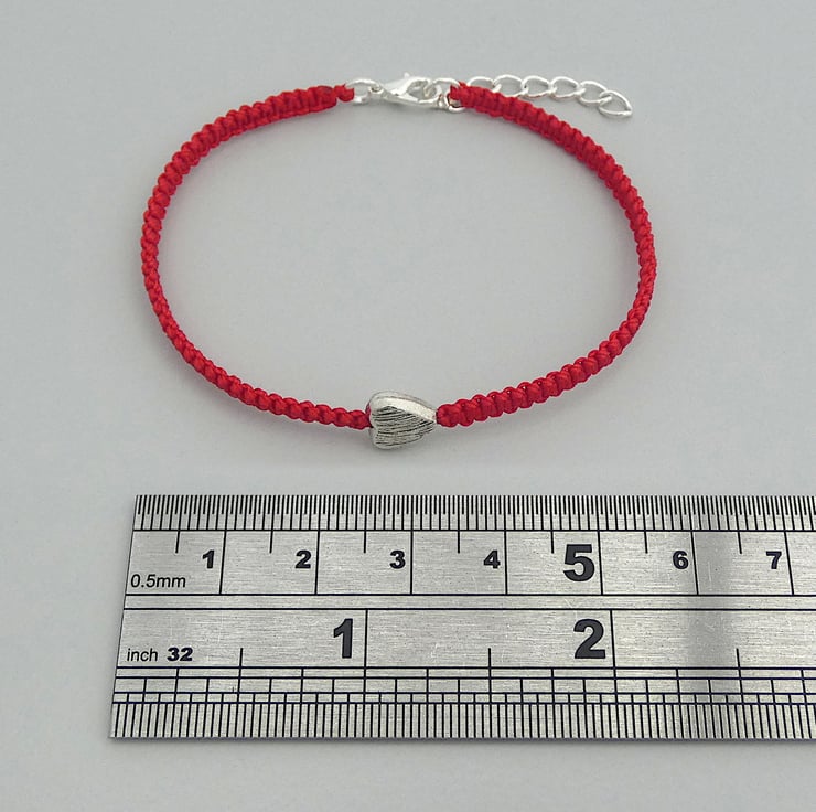 Bright red nylon macramé bracelet with a silver plated textured heart charm. The bracelet is 7" long and can be extended up to 8" using the extender chain on the end of the bracelet. This makes a perfect gift for a loved one when you do not know the exact wrist size of your recipient.