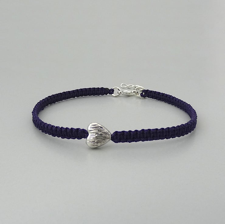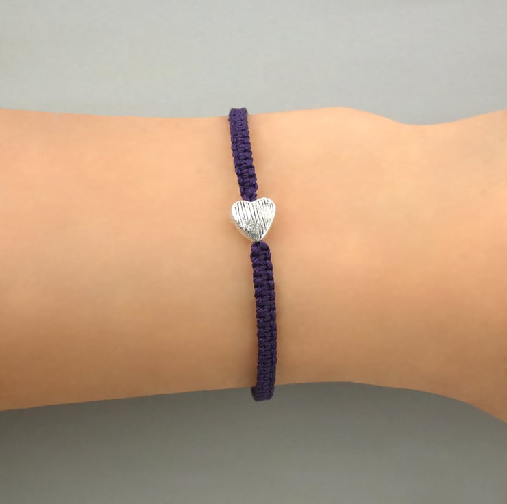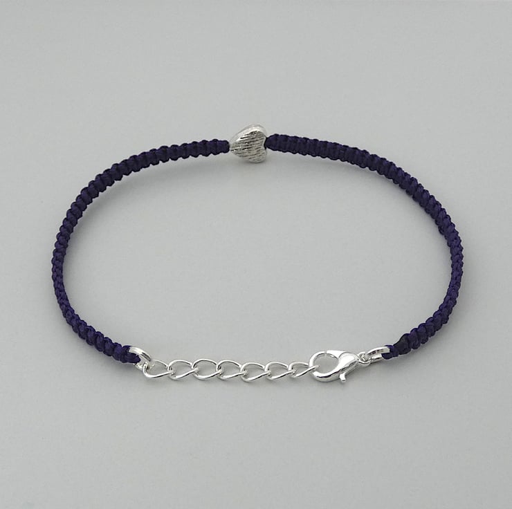 Dark purple nylon macramé bracelet with a silver plated textured heart charm. The bracelet is 7" long and can be extended up to 8" using the extender chain on the end of the bracelet. This makes a perfect gift for a loved one when you do not know the exact wrist size of your recipient.