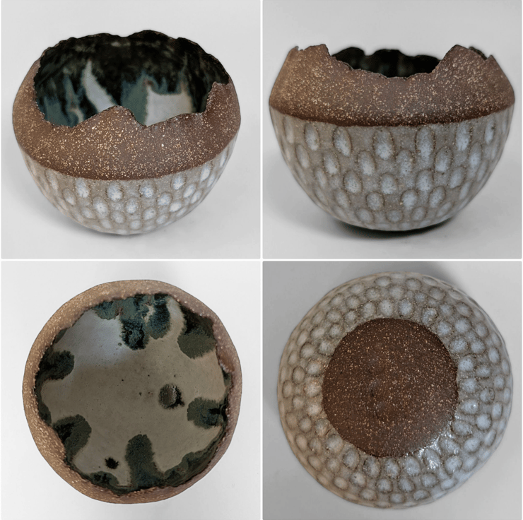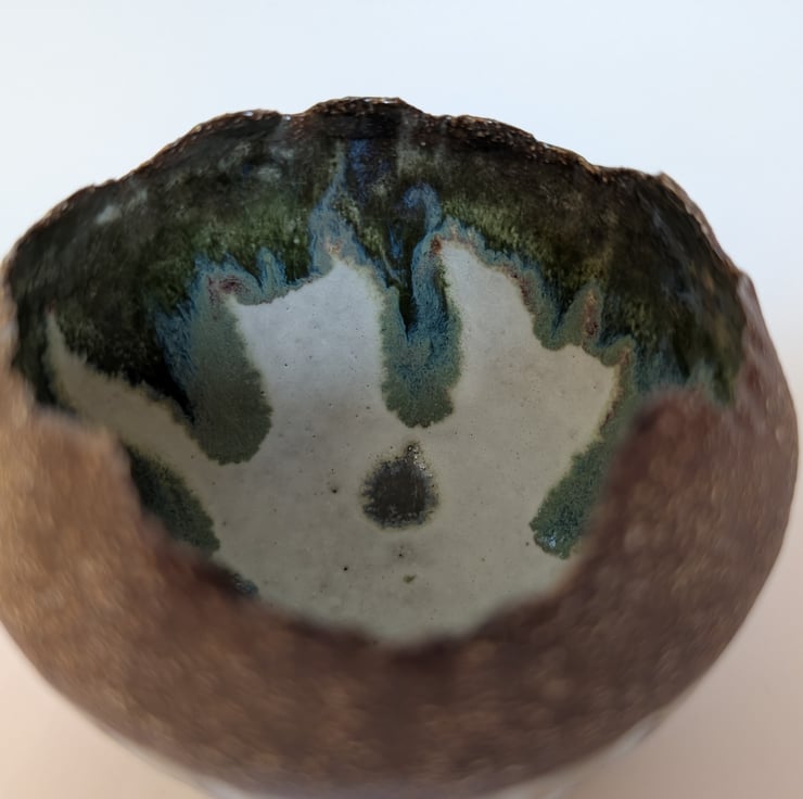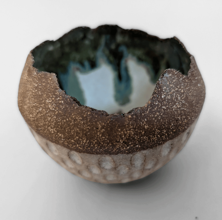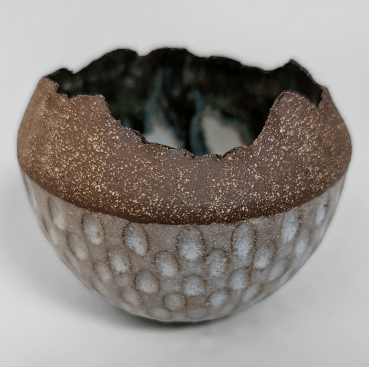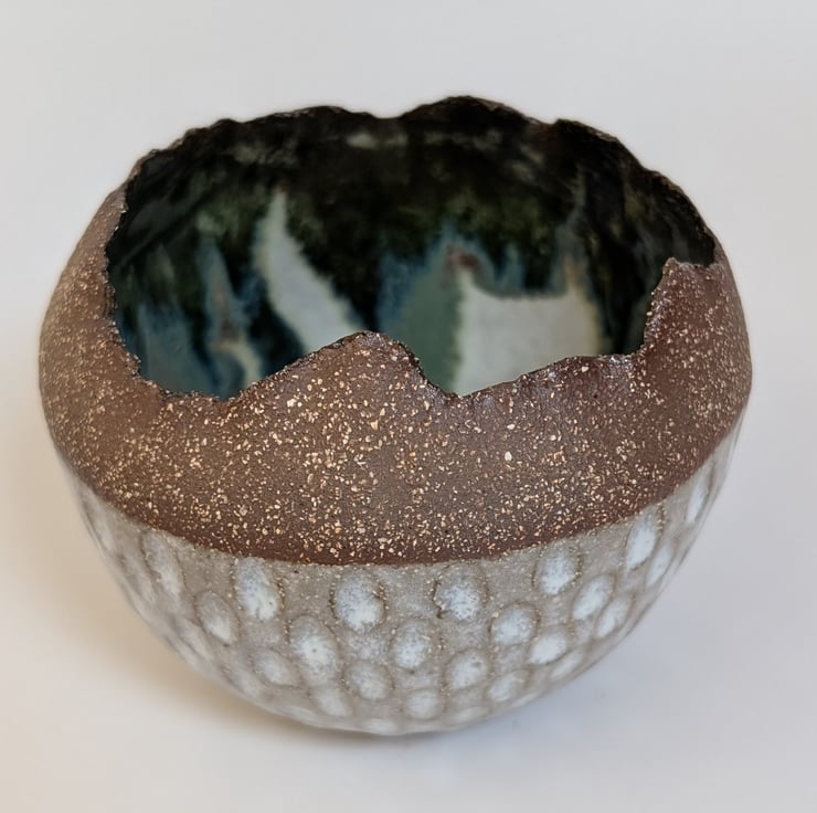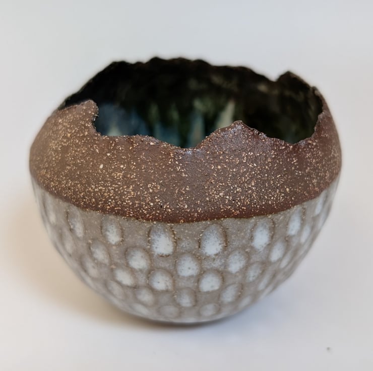 This bowl is coiled in grogged clay with a 'torn' top. The exterior is hand carved to give a tactial surface, finished with a white glaze. The interior has several layers of white and coloured glazes.