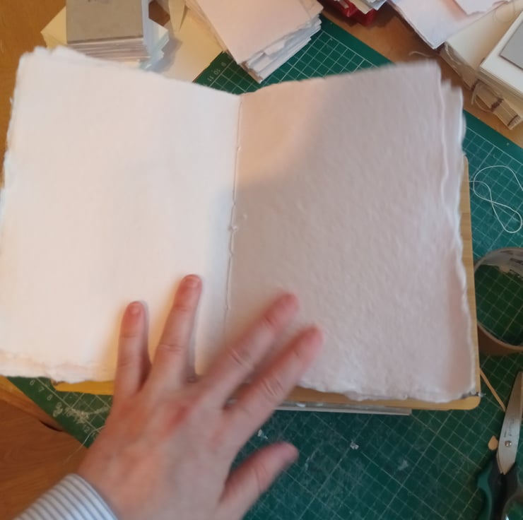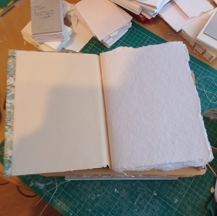 A5 pamphlet stitch cotton rag sketchbook with leather spine and printed marbled hardcover. About 20 pages 40 sides.