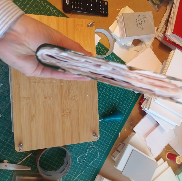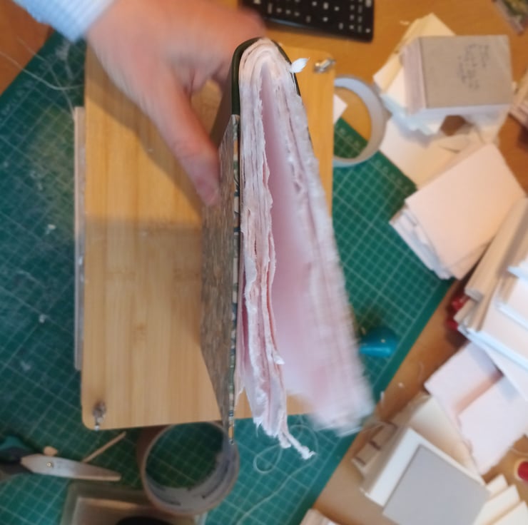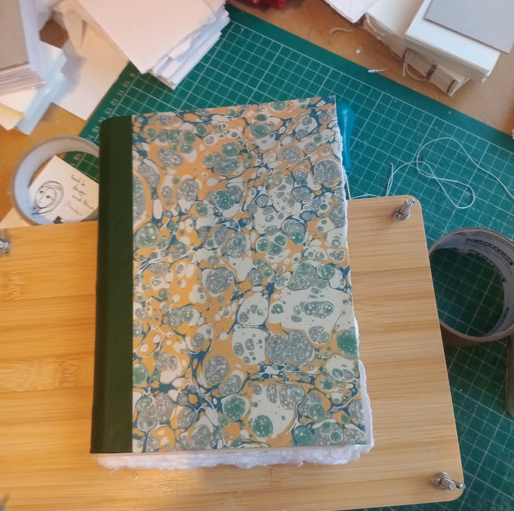 A5 pamphlet stitch cotton rag sketchbook with leather spine and printed marbled