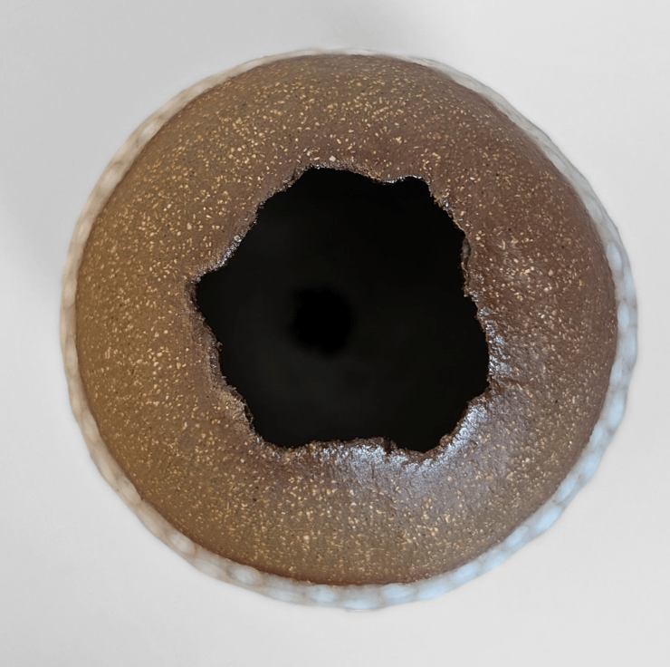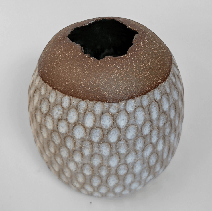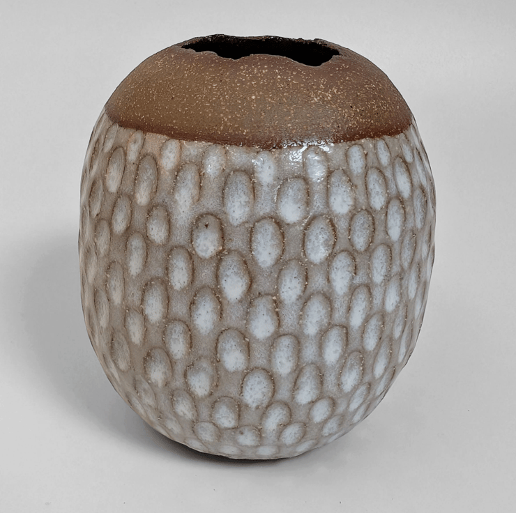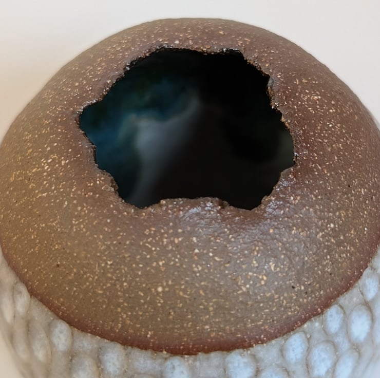 This pot is coiled in grogged clay with a 'torn' top. The exterior is hand carved to give a tactial surface, finished with a white glaze. The interior has several layers of white and coloured glazes.