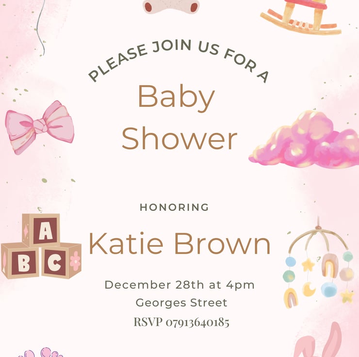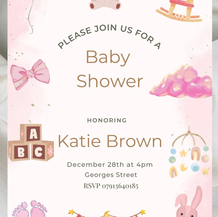 Includes 10x single sided personalised (A6 Size) baby shower invites with envelopes included