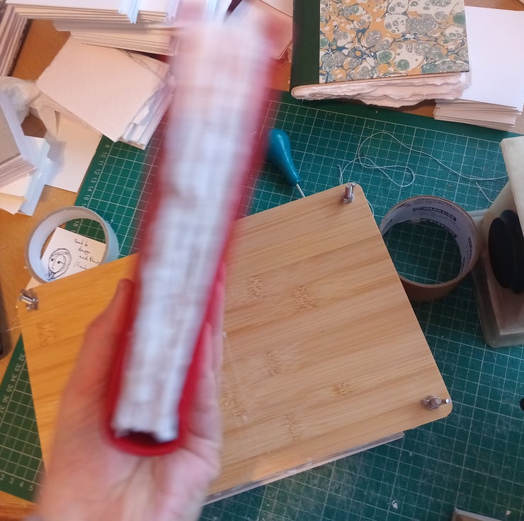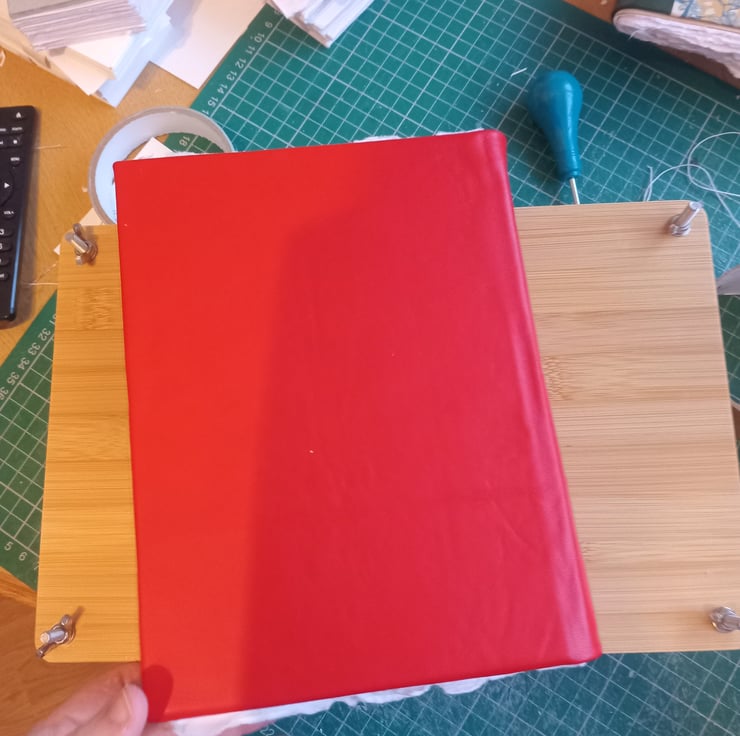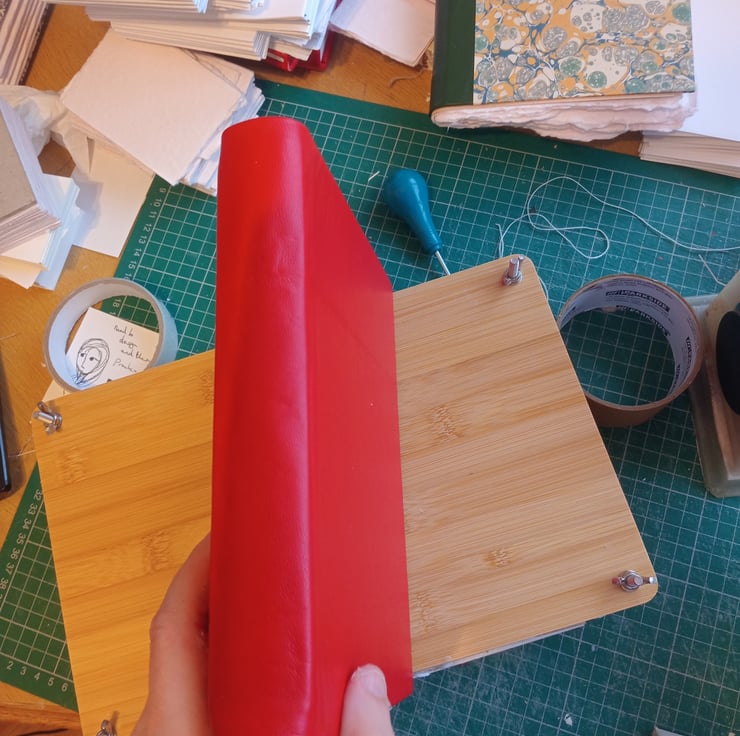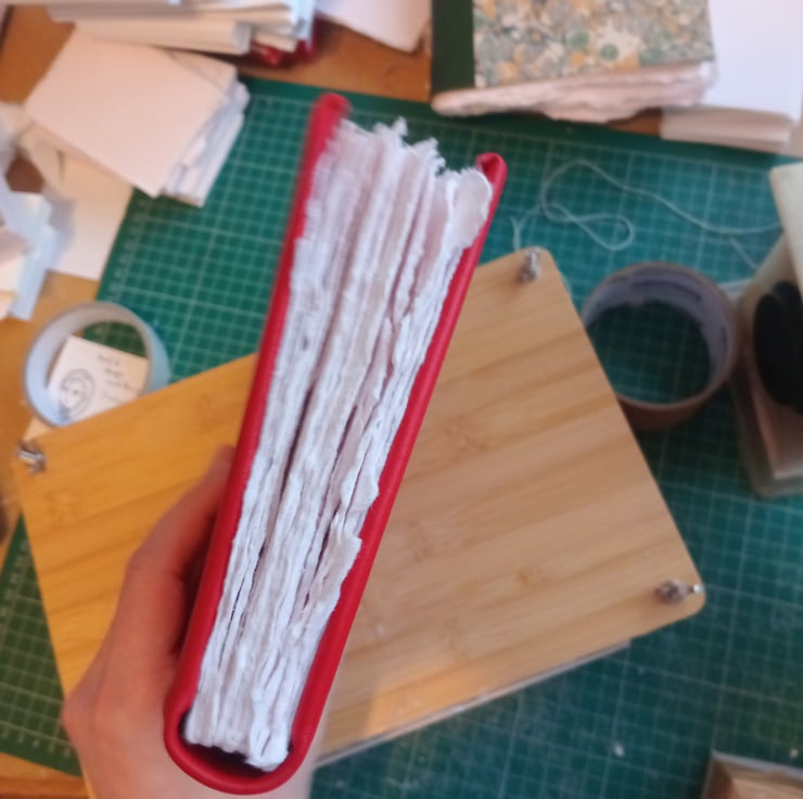 This sketchbook features a red leather over greyboard cover, indian cotton rag paper of circa 250 gsm weight and a mid rough surface hand torn to size, and a linen thread and pva glue binding to provide a good size and thickness for an art journal or portable sketchbook.